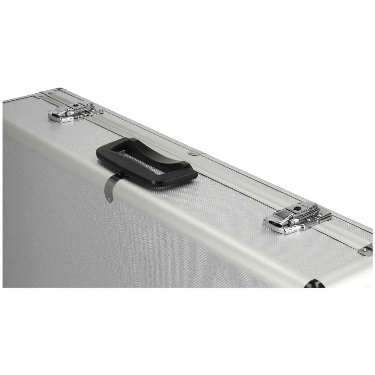 Това е алуминиев куфар за транспортиране на особено чувствителни към повреди инструменти или измервателни уреди. Твърдите стени трайно предпазват транспортираните предмети, а пластмасовите ъгли защитават куфара от повреди и деформации. Вътрешността на чантата е изработена от приятен на допир материал, който гарантира, че повърхностите на съхраняваните в нея предмети ще останат в перфектно състояние. Чантата е оборудвана с подвижни разделители, така че можете да регулирате разположението на куфара според нуждите си. От вътрешната страна на капака има множество джобове, втулки и органайзери, които улесняват съхранението и транспортирането на по-малки предмети. Калъфът се затваря с метални закопчалки, които осигуряват стабилно и здраво затваряне. Пластмасовата дръжка осигурява добър захват. Куфарът има и регулируема лента за носене с ремък за рамо.Свойства на алуминиевия куфар за инструменти DEDRA N0007 640x320x150 сребрист: