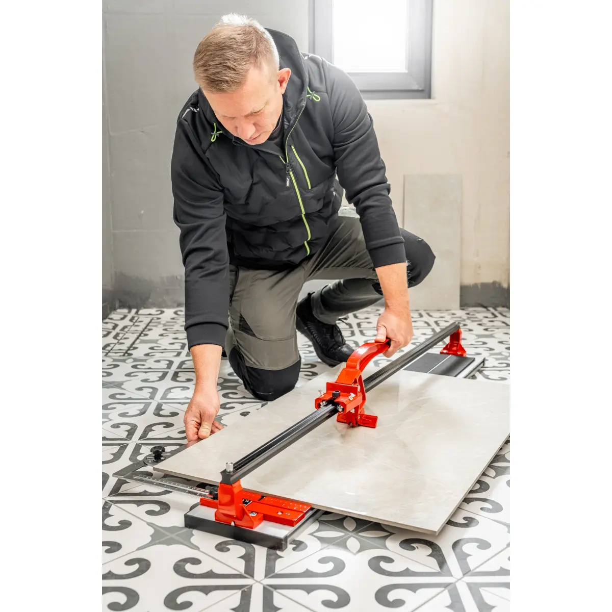 Je určen proz p r a co v án í obkladů a terakoty. Stroj umožňuje provádět základní operaceřezání dlaždic. Kombinovaný řezný nůž s ložisky a účinný doraz jsou uloženy na jediném ocelovém vedení ve tvaru X. Stabilní základna stroje je vyrobena z hliníku.