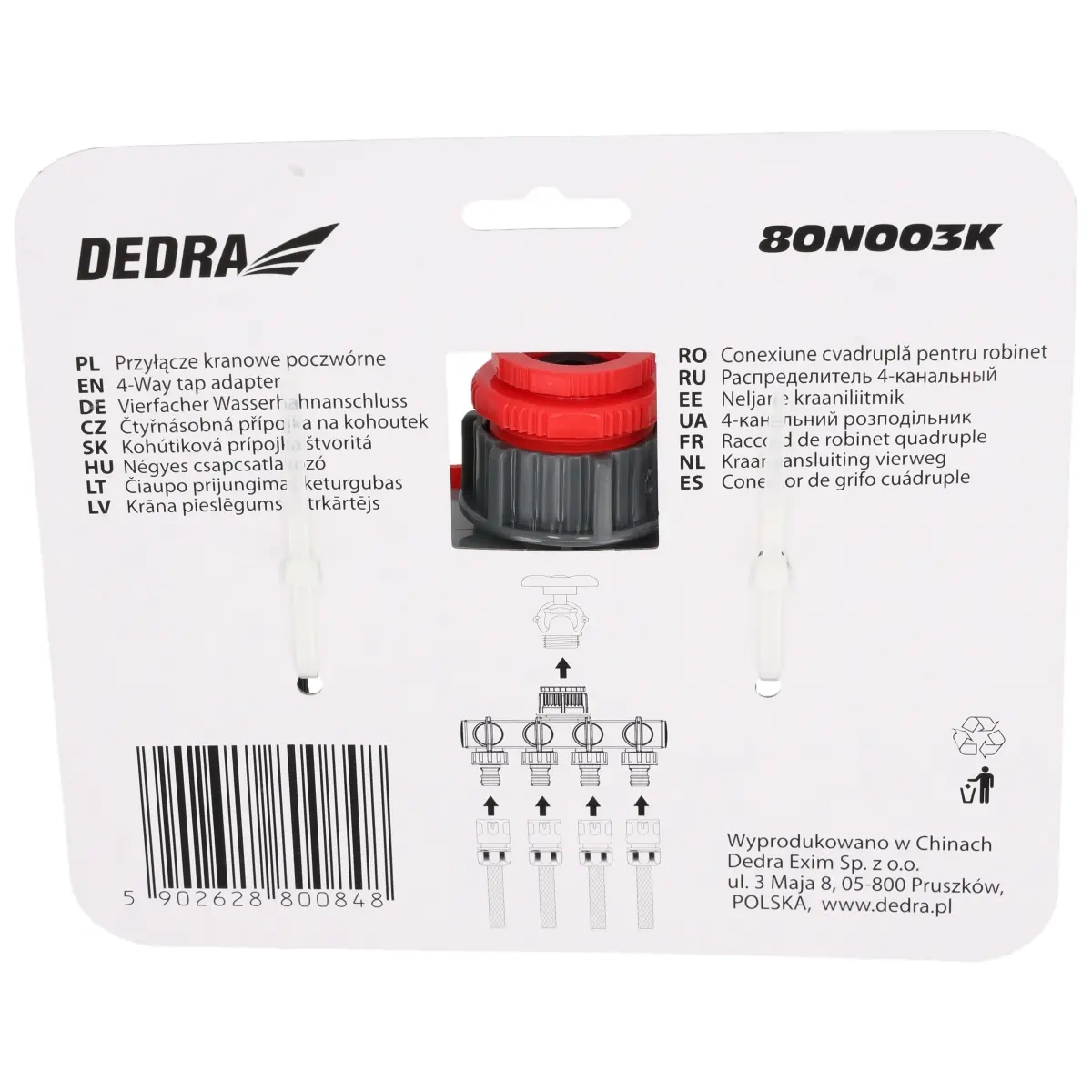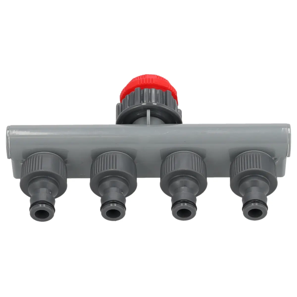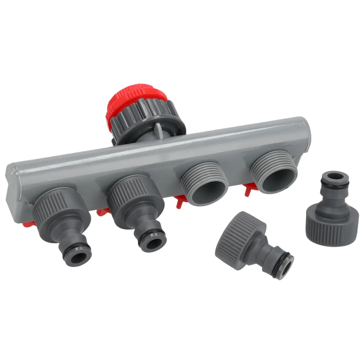 Tatočtyřnásobná přípojka umožňuje vytvářet komplexní zavlažovací systémy. Umožňuje použití technických kohoutů velikosti 1" (s redukcí 3/4" a 1/2") pro připojení zahradních hadic, zavlažovačů nebo programátorů. Připojení je doplněno 4 rychlospojkami. Díky čtyřnásobnému provedení lze nezávisle na sobě zásobovat vodou čtyři systémy. Odpadá potřeba problematických T-kusů a není třeba se starat o utěsnění systému. Vestavěné ventily umožňují upravit průtok nebo zcela uzavřít vybraný konec, aniž by bylo nutné vypínatvodovodní ventil. Výrobek se prodává s marketingovou kartou.