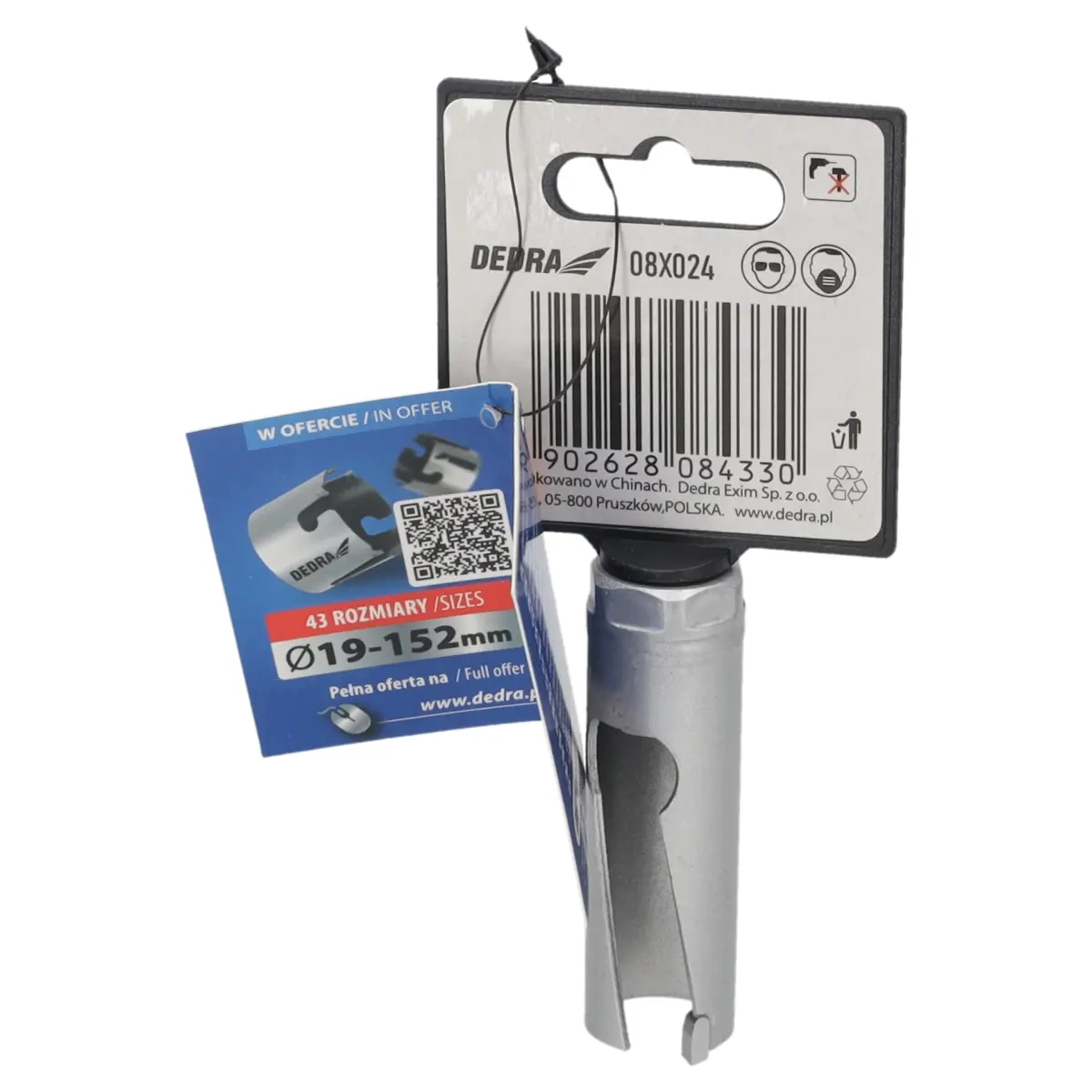 Uniwersalna otwornica widiowa to narzędzie niezbędne w warsztacie majsterkowicza. Specjalna konstrukcja korpusu z nacięciem zwiększa wytrzymałość otwornicy oraz polepsza prowadzenie otworu. Dzięki zastosowaniu uchwytów HEX 10mm 1/2" 08X001 (rekomendowany do otwornic: 08X019 - 08X030) i 5/8" 08X002 (rekomendowany do otwornic: 08X032 - 08X152) możliwe jest wykorzystanie otwornicy w wiertarkach czy wiertarko-wkrętarkach. Stosując uchwyt SDS+ 08X003 (rekomendowany do otwornic: 08X032 - 08X152) możemy wykorzystać otwornice widiowe DEDRA 08X z młotowiertarką w trybie wiercenia bezudarowego. Dla polepszenia efektów skrawania i zwiększenia wytrzymałości, otwornice posiadają kilka płytek widiowych, które efektywnie urabiają obrabiany materiał. Wykorzystując odpowiednie wiertło pilotowe, koronki uniwersalne z widią DEDRA 08X można wykorzystać do pracy w drewnie, metalu, płytach meblowych, PCV, materiałach mineralnych jak bloczki ceramiczne, beton komórkowy czy silikat. W celu zwiększenia wytrzymałości otwornic ich korpus został wykonany z wysokogatunkowej stali #45 HCS o grubości 1,5mm, a zęby wykonane z węglika wolframu z 6% dodatkiem kobaltu (stal wolframowa YG6X). Dzięki temu poprawiona została jakość, wytrzymałość koronek oraz zwiększono skuteczność wiercenia.