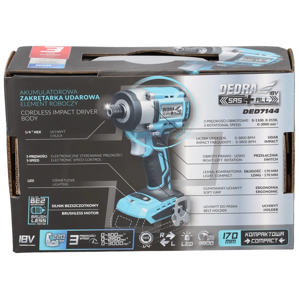Kompaktní, malé rozměry [170 mm] usnadňují práci v těžko přístupných místech a vysoký točivý moment [220 Nm] zajišťuje, že nářadí je dostatečně výkonné pro danou práci. Šroubovák DED7144 je proto ideální pro vyšroubování nebo zašroubování zadřených šroubů nebo vrutů. Rukojeť 1/4" je vybavena přídavnou aretací, která drží bit v rukojeti a zabraňuje jeho vypadnutí během práce.