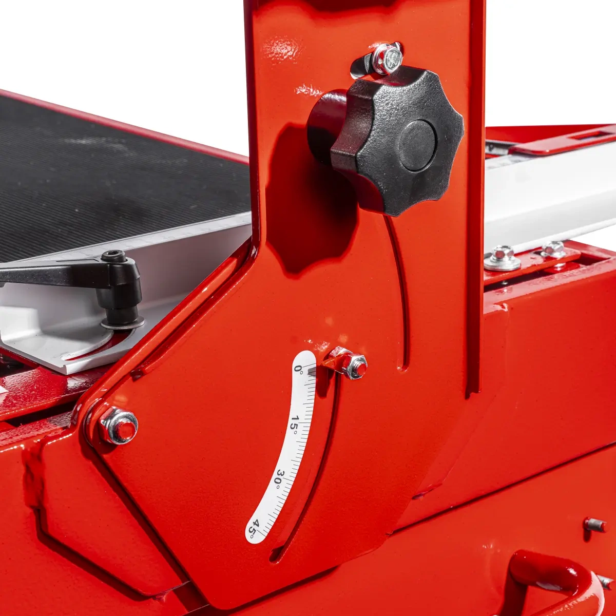 Stroj je vybaven ocelovou pracovní deskou o rozměrech 1250x460 mm, jejíž pracovní plochu lze dále zvětšit odklopením přídavných bočních pracovních desek - což je důležité usnadnění zejména při práci s velkými deskami, kdy je zapotřebí dodatečná opora. Kromě toho byla pracovní deska potažena vrstvou pryže, která zajišťuje vysokou přilnavost desky k povrchu - díky tomu materiál pevně drží, což usnadňuje přesné řezání.