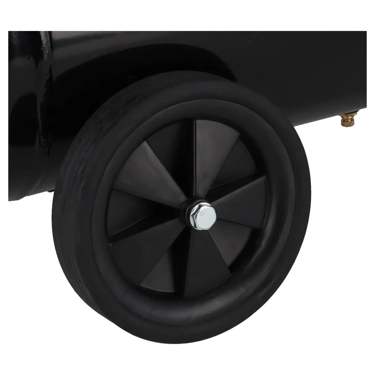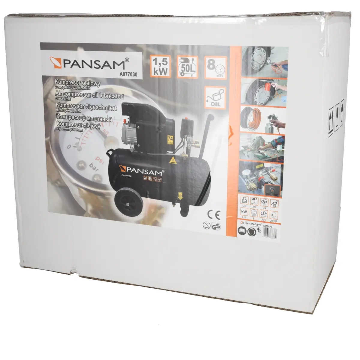The PANSAM A077030 oil compressor is designed for compressing atmospheric air and can be used for a variety of tasks including blowing, cleaning, washing, inflating tires, and painting with the appropriate tools. It features a 1500W motor and a 50-liter tank, providing ample capacity for extended use. Large transport wheels ensure easy mobility of the compressor, while its dual pressure gauges and connection ports enhance operational efficiency.