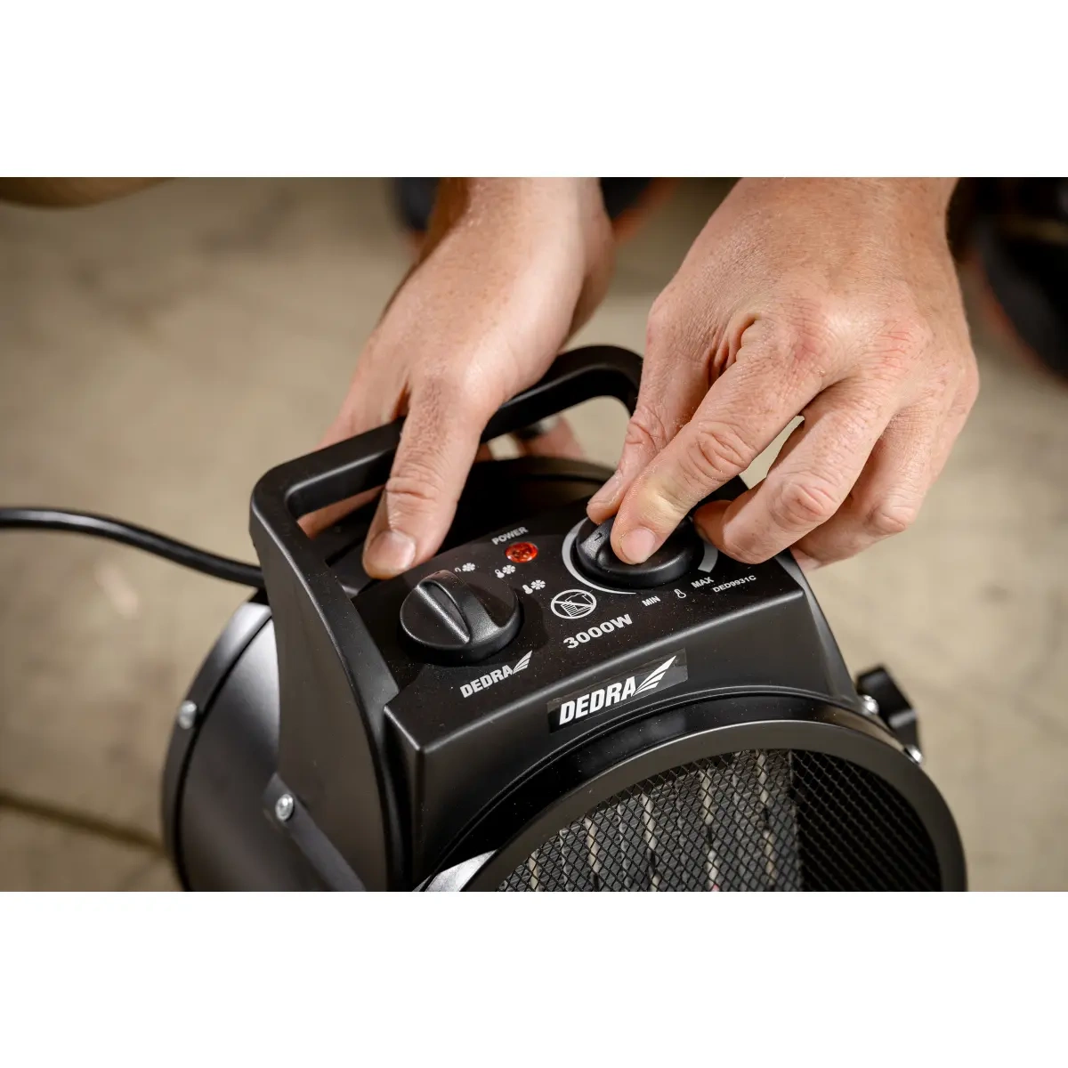 The DEDRA DED9931C 3.0 kW Electric Heater is a round, black heater with a ceramic PTC heating element, designed for use in enclosed spaces.