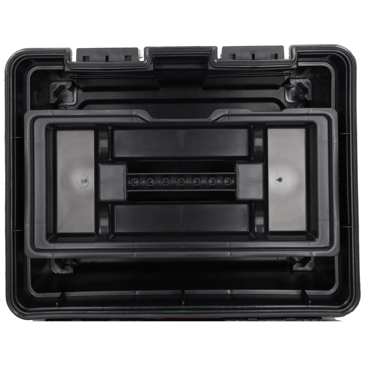 The second module contains a box with four ergoboxes-the workshop tray-like containers provide quick access to the assembly components you need at hand at all times, e.g. bolts, anchors, nuts, etc. Thanks to the closed plastic housing, the components are protected against water splashes, dust and dirt. Thanks to the closed plastic housing, the components are protected against water splashes, dust and dirt. In addition, they protect the contents from unplanned movement. Ergoboxes can be taken out of the box at any time. A special inner lock prevents the containers from accidentally slipping out or falling out of the toolboxbody.