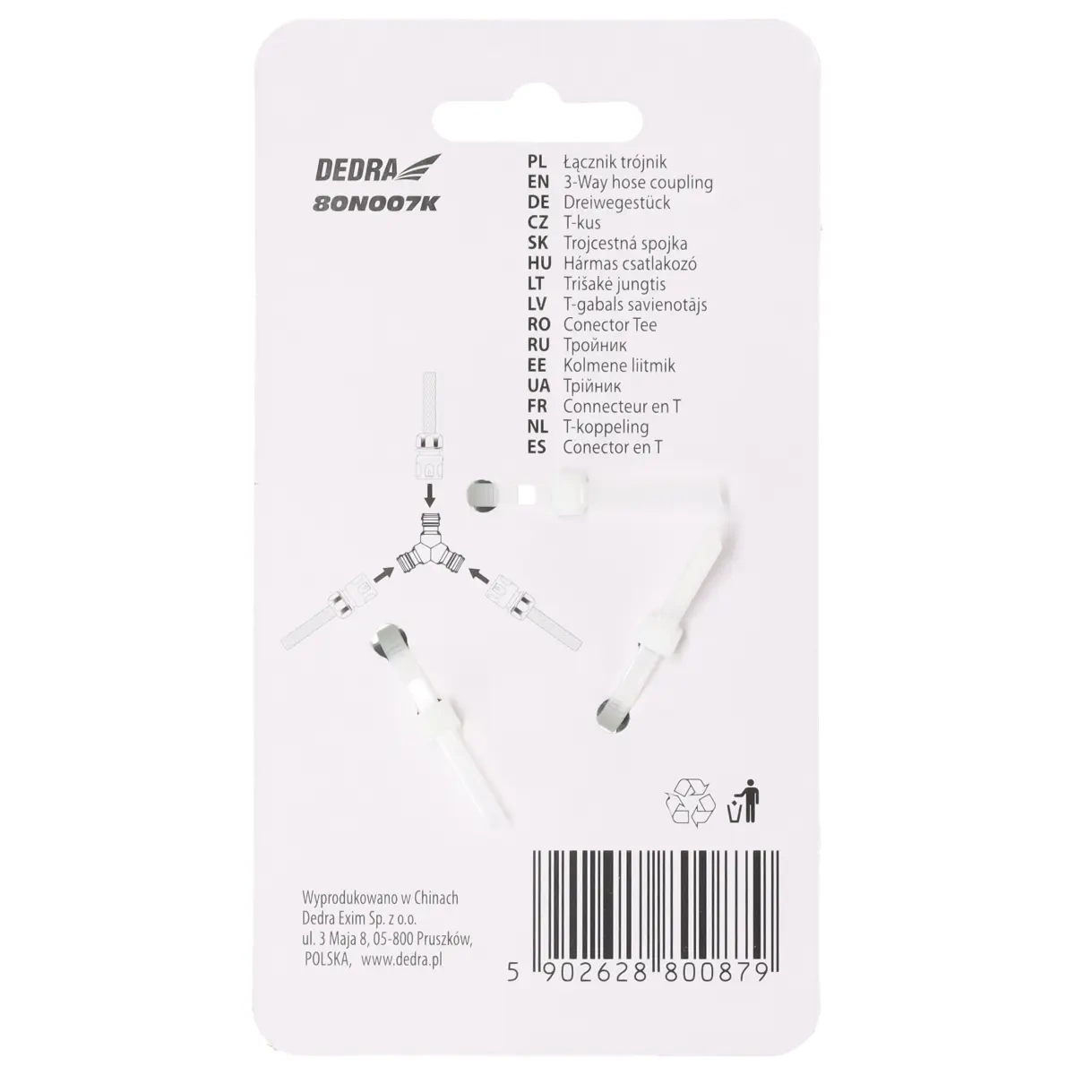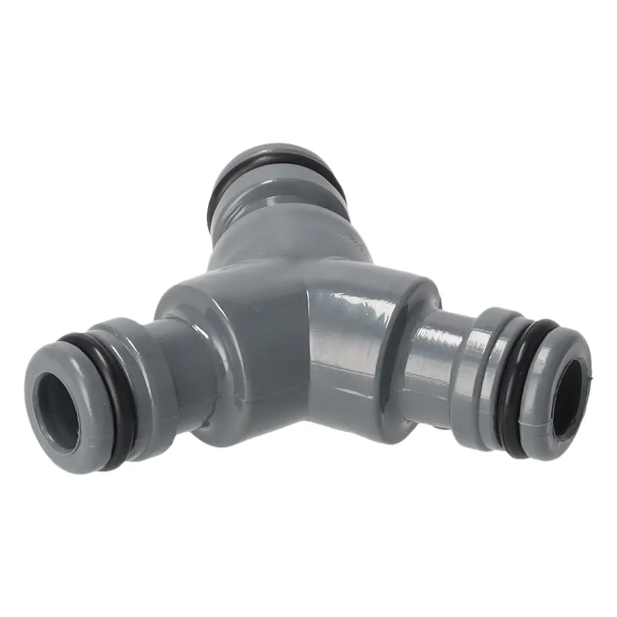 This "T" type connector allows for the quick splitting of water to separate garden hoses using 1/2" quick connectors. Made from durable ABS plastic, the connector ensures a robust and reliable construction. It facilitates easy expansion of the water line, making it ideal for large garden areas. The product is sold with a marketing card.