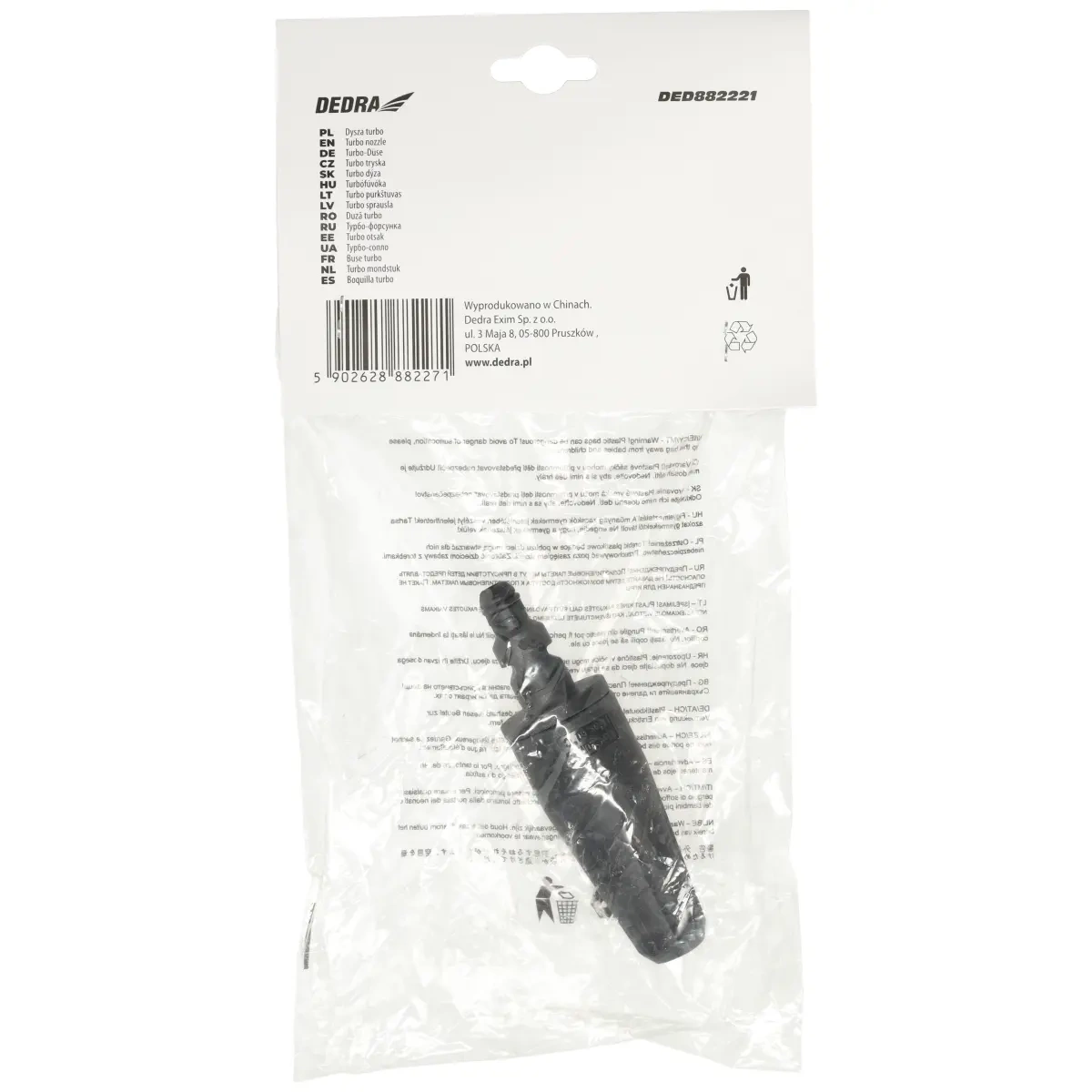 The turbo nozzle DED882221 is designed for use with DEDRA pressure washers DED8824 and DED8825. With the turbo nozzle, you can maximize cleaning performance and efficiency. It effectively removes even the most stubborn dirt from the surface being cleaned. This product is recommended for use with lance DED882220