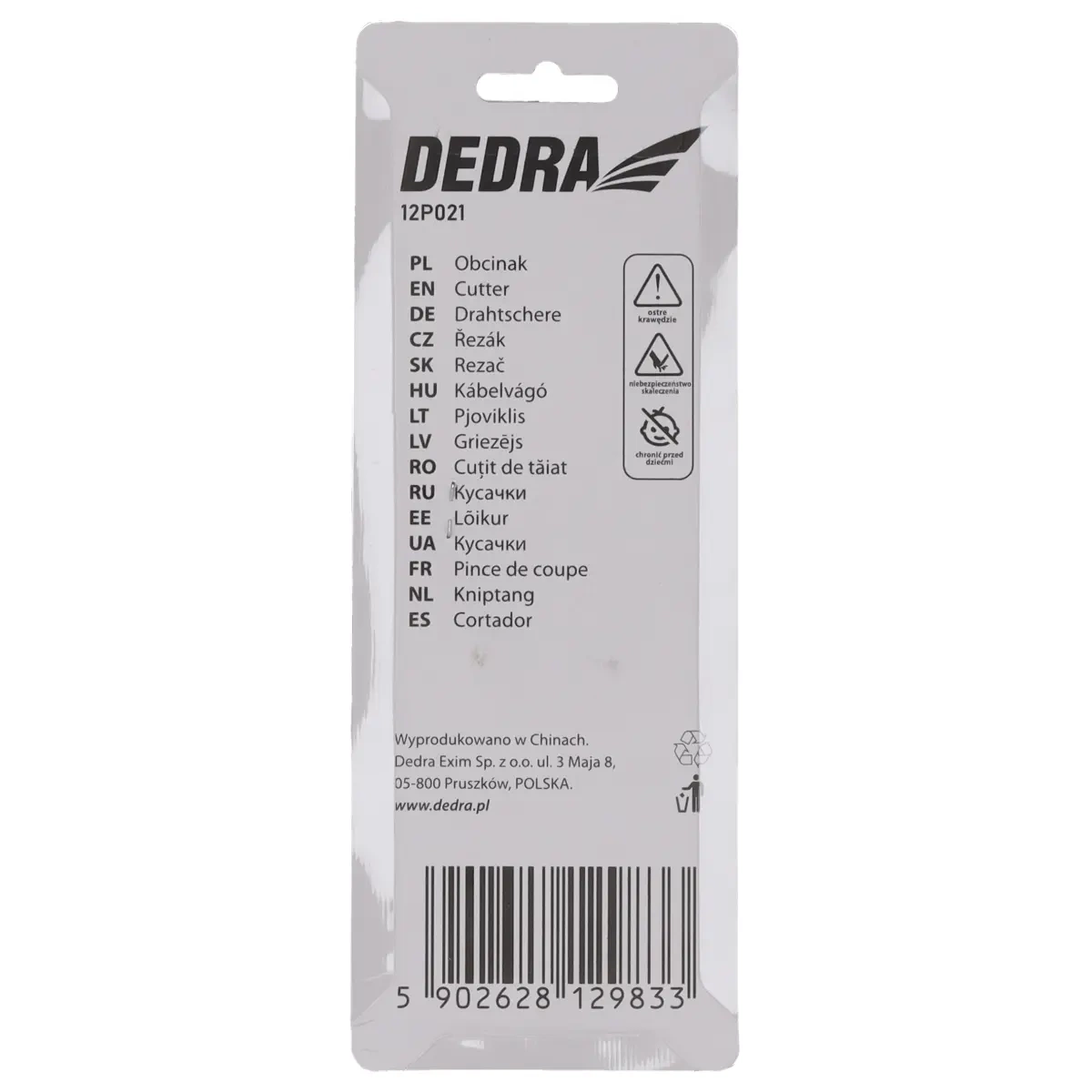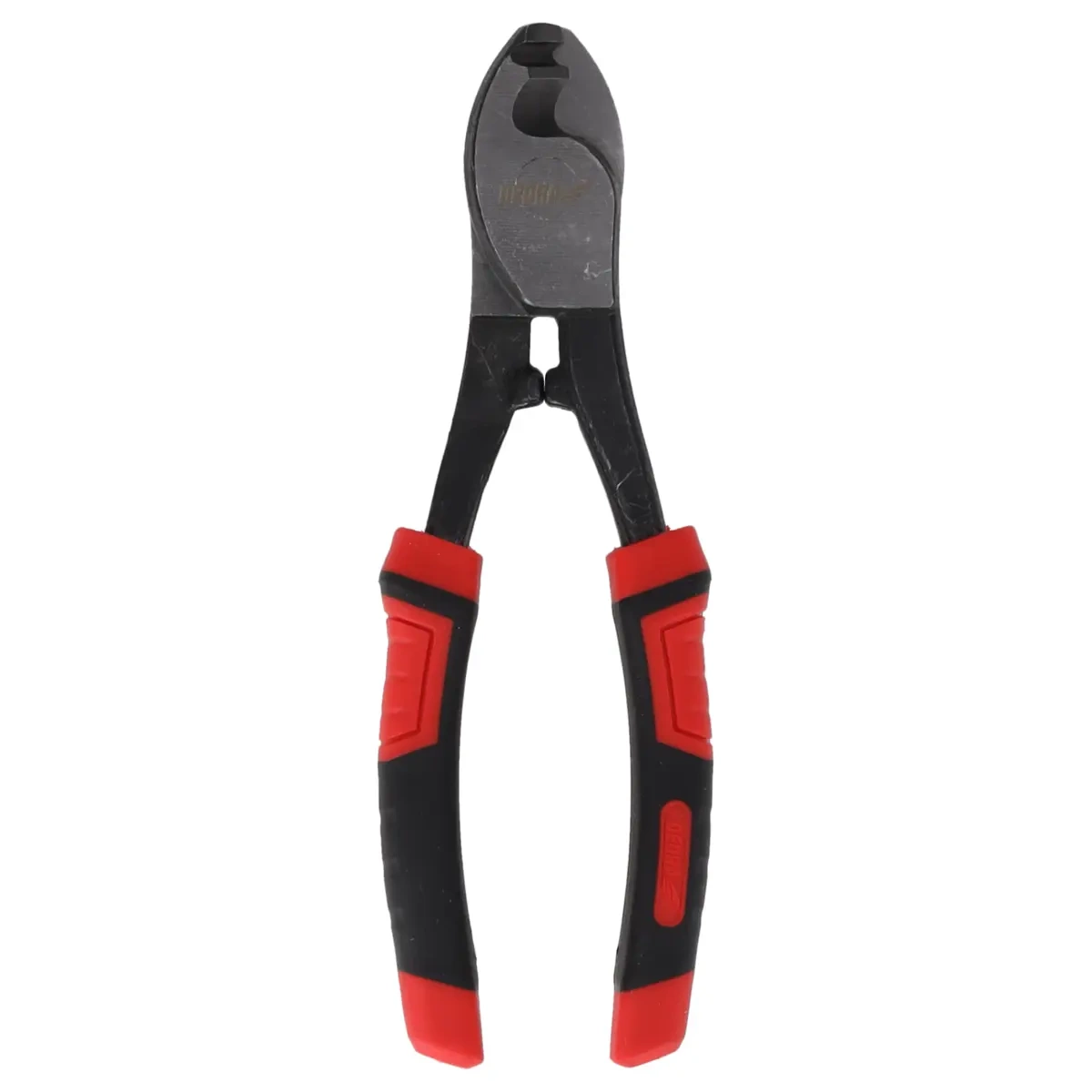 The DEDRA 12P021 wire and cable cutter is designed for safe and effective cutting of copper or aluminium wires and cables. The handy arms of the cutter allow effective cutting of components with cross sections up to 16 mm. The cutter has an overall length of 160mm, the handles are coated with soft TPR plastic and the blades are made from CrV steel with a hardness of HRC50 to ensure efficient cutting.