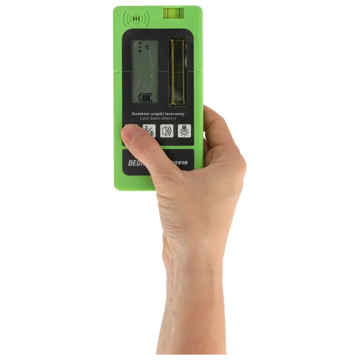 The Laser Beam Detector has a built-in loudspeaker with two acoustic tones which function as a "buzzer" - a sound signal when a beam is detected. The detector is compatible with green laser beams, e.g. DEDRA MC0903, MC0904, MC0905, MC0906, MC0907 as well as red, e.g. DEDRA MC0901. The unit is easy to operate with an easy-to-read backlit display, a bracket for mounting on a lathe and a 1/4" thread for mounting on a tripod.