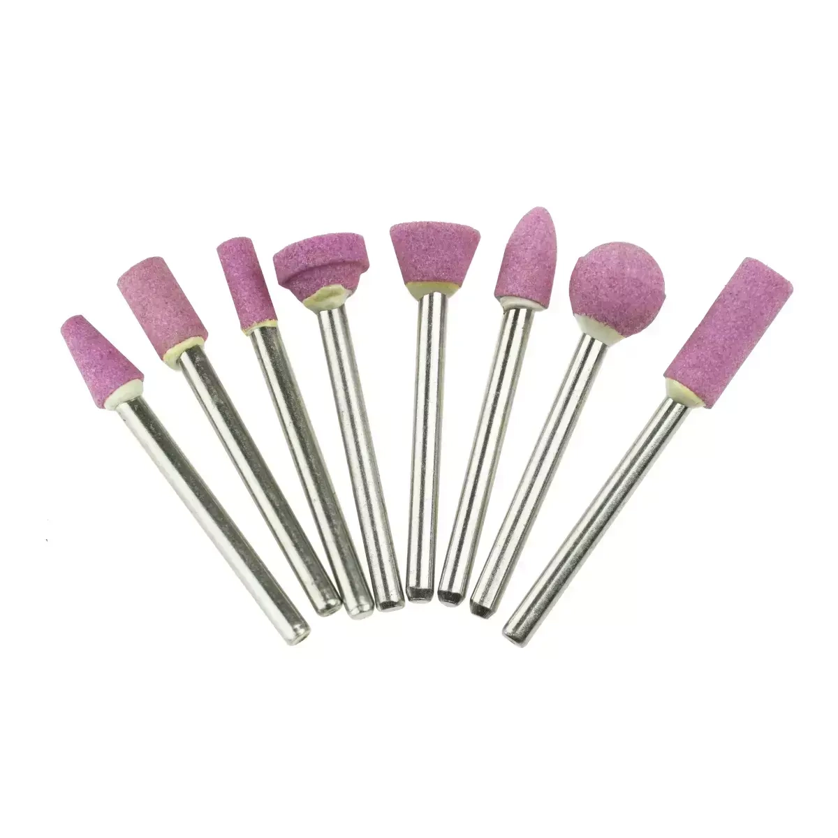 Set of 8 pieces for mini grinder, precision grinding machine. The set consists of 8 grinding stones of different shapes for precision sanding of small objects and surfaces. Each grinding stone is bonded to a 3.2mm shank.
