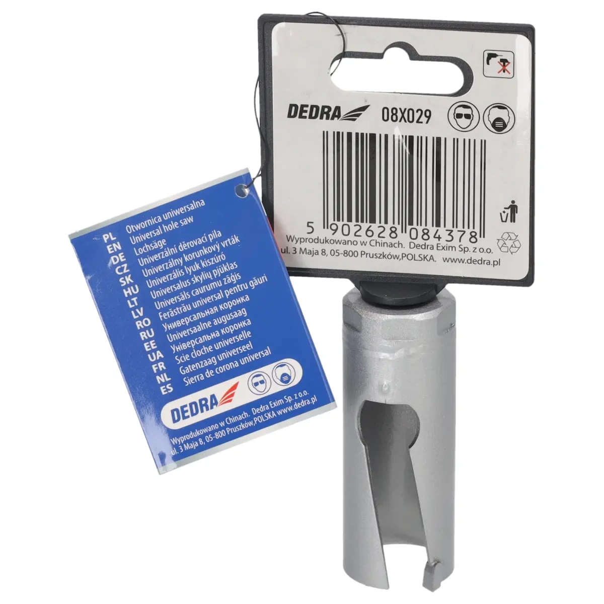 The actual size is shown in the product description. The universal forked hole saw is an indispensable tool in theDIY workshop. The special design of the cutting edge increases the strength of the hole saw and improves hole guidance. With the use of HEX 10 mm 1 /2" chucks 08X001 (recommended for holes: 08X019-08X030) and 5/8" chucks 08X002 (recommended for holes: 08X032-08X152), it is possible to use the hole saws on drills or drill-drivers.Using the SDS+ chuck 08X 003 (recom mendedfor holes: 08X 032 - 08X152), it is possible to use the DEDRA 08 X widespread holesaw with a hammer drill in non-impact drilling mode. In order to improve the cutting effect and increase strength, the holes have several fork inserts that effectively machine the material. Using the appropriate pilot drill bit, the DEDRA 08 X universal pilot bits can be used for work in wood, metal, furniture panels, PVC, mineral materials such as ceramic tiles, cellular concrete and silicate.In order to increase the strength of thebore holes, the core is made from high-grade #45 HCS steel with a thickness of 1.5 mm and the teeth are made from tungsten carbide with 6% cobalt (tungsten steel YG 6X). This improves the quality and durability of the cuttings and increases the efficiency of the drilling.