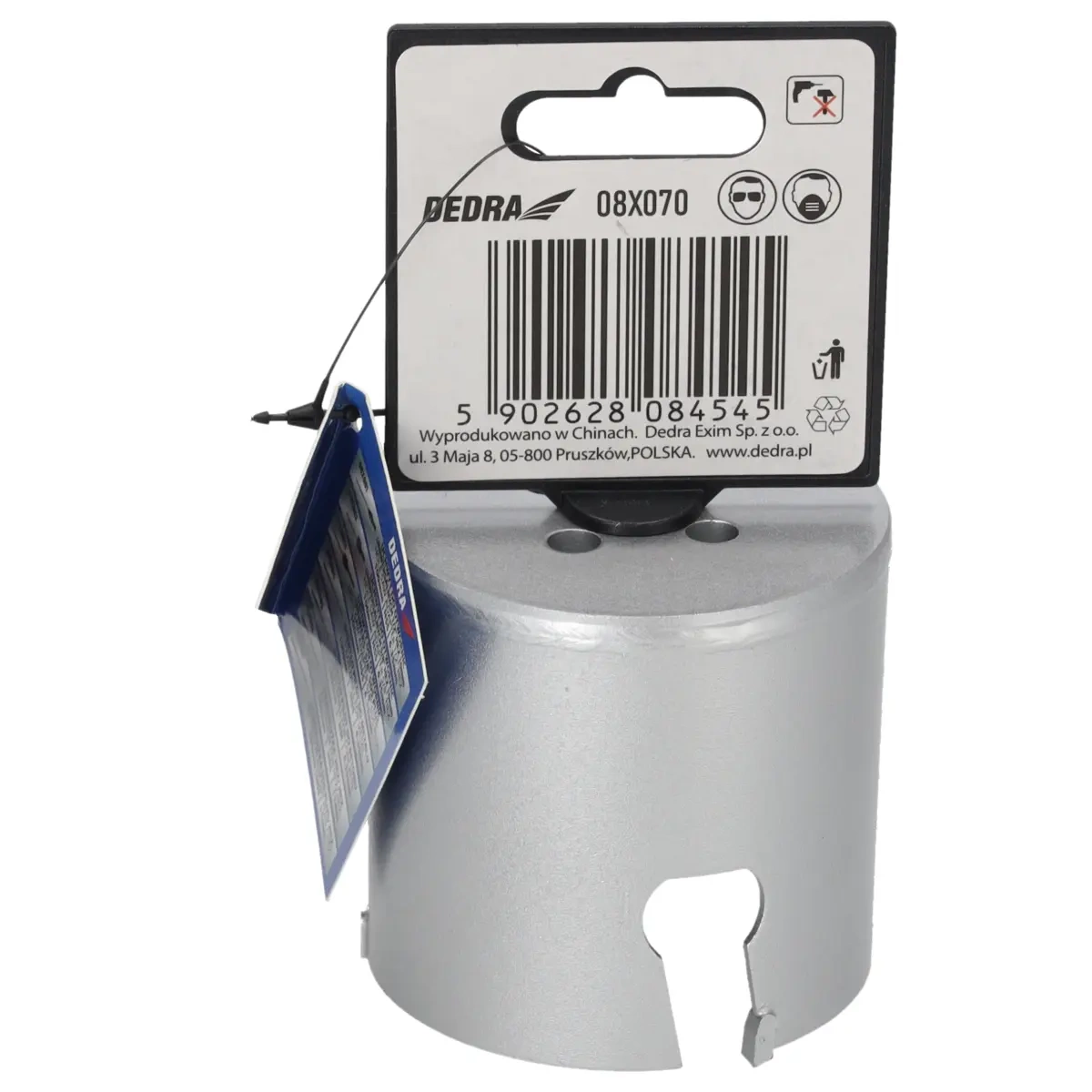 The universal hole saw is an indispensable tool in the DIY workshop. The special design of the cutting edge increases the strength of the hole saw and improves hole guidance. With the use of HEX 10 mm 1 /2" chucks 08X001 (recommended for holes: 08X019-08X030) and 5/8" chucks 08X002 (recommended for holes: 08X032-08X152), it is possible to use the hole saws on drills or drill-drivers.Using the SDS+ chuck 08X 003 (recom mendedfor holes: 08X 032 - 08X152), it is possible to use the DEDRA 08 X widespread holesaw with a hammer drill in non-impact drilling mode. In order to improve the cutting effect and increase strength, the holes have several fork inserts that effectively machine the material. Using the appropriate pilot drill bit, the DEDRA 08 X universal pilot bits can be used for work in wood, metal, furniture panels, PVC, mineral materials such as ceramic tiles, cellular concrete and silicate.In order to increase the strength of thebore holes, the core is made from high-grade #45 HCS steel with a thickness of 1.5 mm and the teeth are made from tungsten carbide with 6% cobalt (tungsten steel YG 6X). This improves the quality and durability of the cuttings andincreases the efficiency of the drilling.