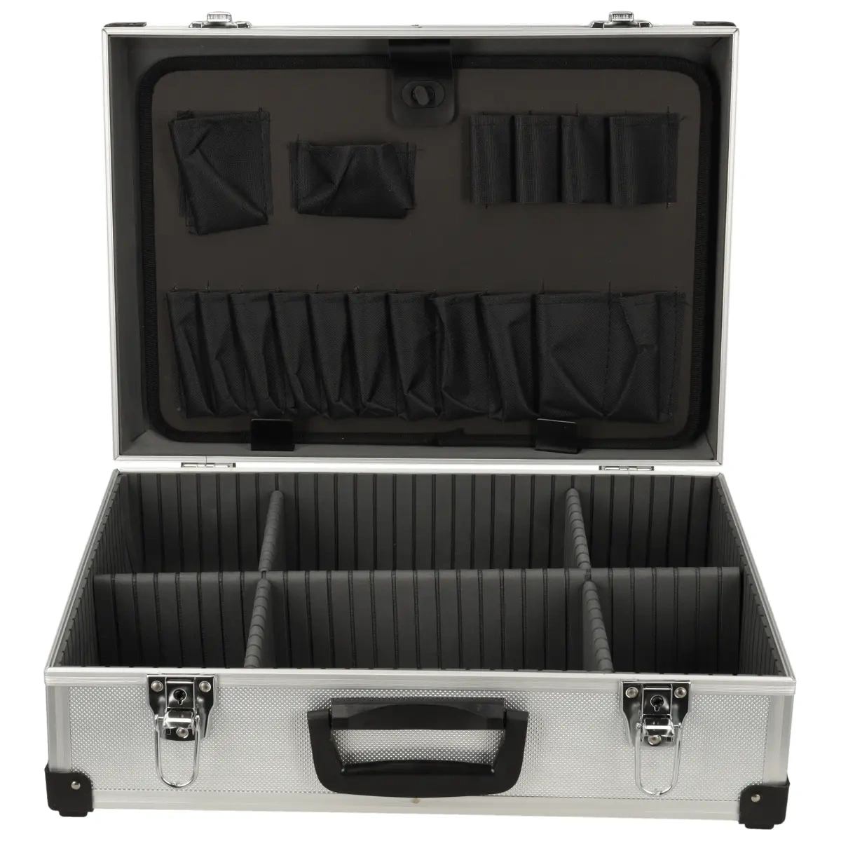 See on alumiiniumist kohver eriti kahjustustundlike tööriistade või mõõteriistade transportimiseks. Jäigad seinad kaitsevad transporditavaid esemeid püsivalt ja plastist nurgad kaitsevad kohvrit kahjustuste ja deformatsiooni eest. Koti sisemus on valmistatud mõnusast materjalist, mis tagab, et selles hoitavate esemete pinnad püsivad ideaalses seisukorras. Kott on varustatud teisaldatavate vaheseinadega, et saaksite kohvri paigutust kohandada vastavalt oma vajadustele. Kaane siseküljel on arvukalt taskuid, torusid ja korraldajaid, mis lihtsustavad väiksemate esemete hoiustamist ja transportimist. Kohver suletakse metallkinnitustega, mis tagavad stabiilse ja kindla sulgemise. Plastist käepide tagab hea haarde. Kohvril on ka reguleeritav kanderihm koos õlarihmaga.Alumiiniumist tööriistakohvri DEDRA N0001 omadused: