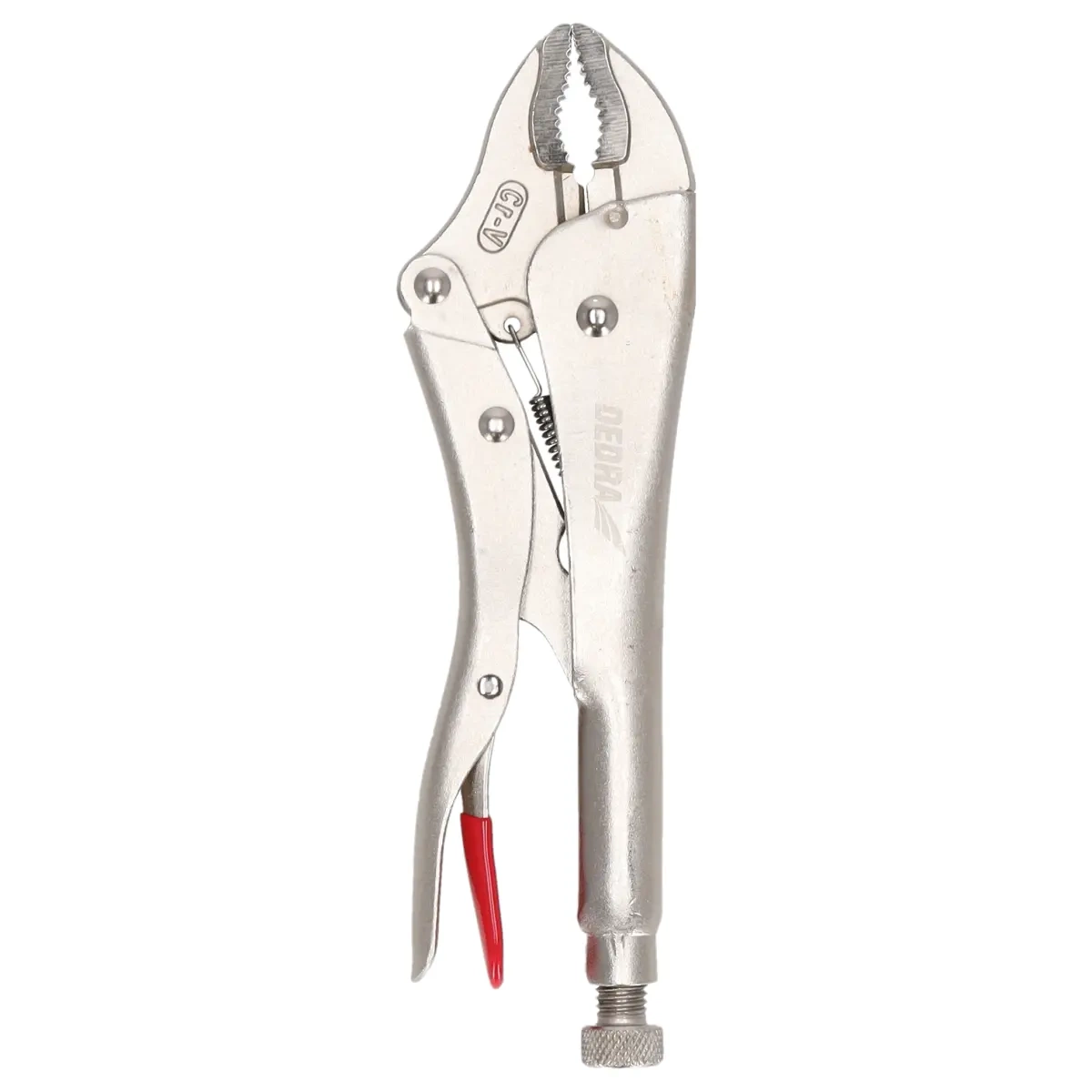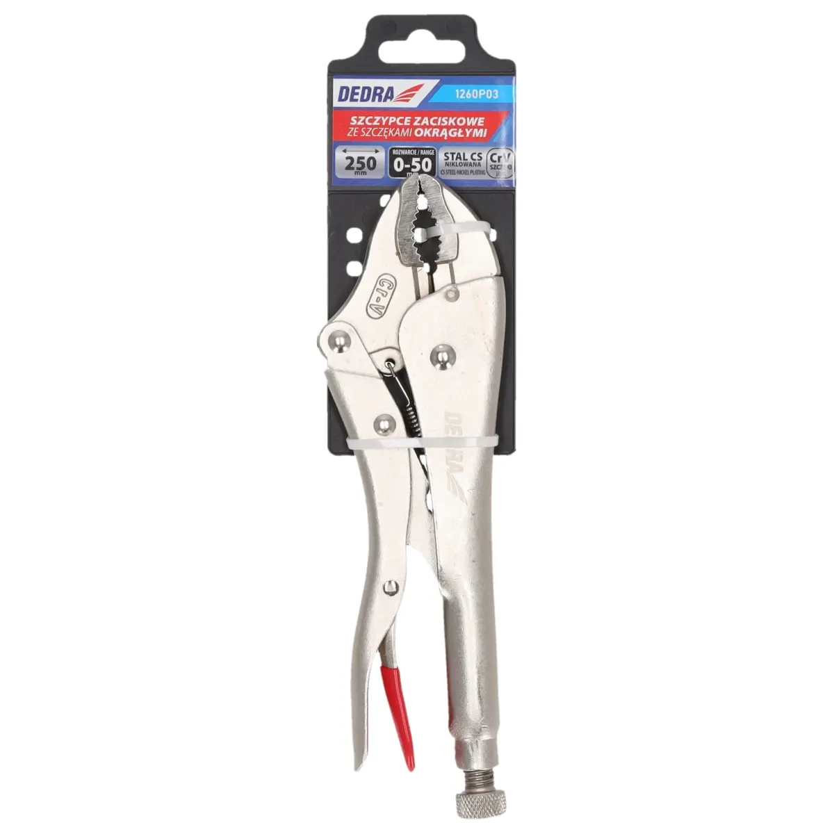A DEDRA 1260P03 krimpelő fogó kerek pofákkal rendelkezik, így könnyebben megragadhatók a kerek alakú tárgyak, például csövek vagy rudak. A pofák távolsága 0 és 50 mm között állítható, a fogó hossza pedig 250 mm.