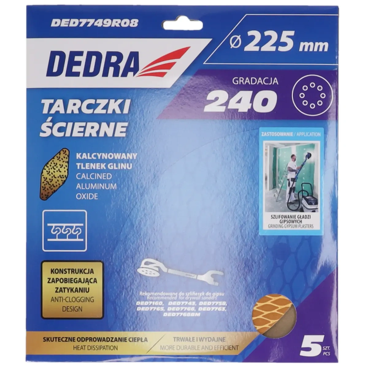 Dugulásgátló csiszolókorongok 225mm, #240, tépőzáras, 5 db-os készlet, DEDRA DED7749R08