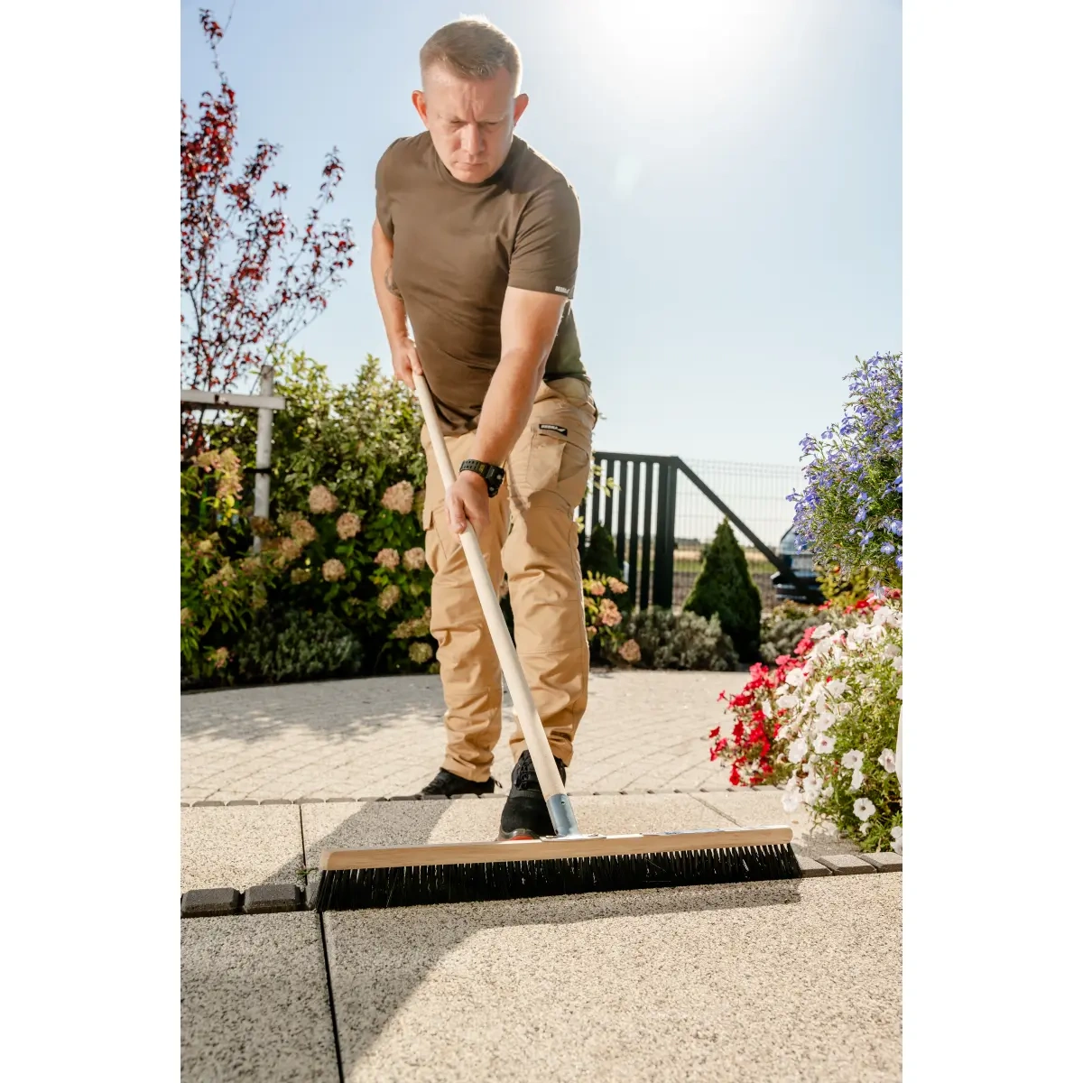 A fém nyélrögzítő további megerősítést ad a seprű szerkezetének, növelve a stabilitást munka közben, és minimalizálva a nyél elhúzódásának kockázatát intenzív seprés közben. A sörték kemikáliákkal szemben ellenálló műanyagból készültek, így hatékonyan távolítják el a szennyeződéseket még a durva és egyenetlen felületekről, mint a térkövek vagy aszfalt.