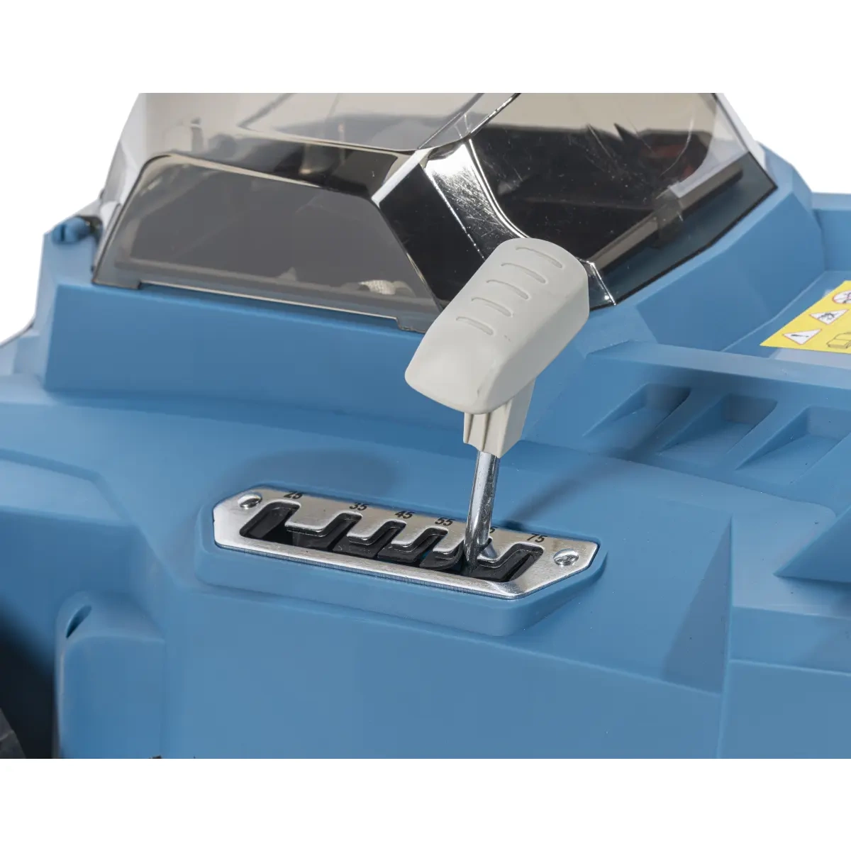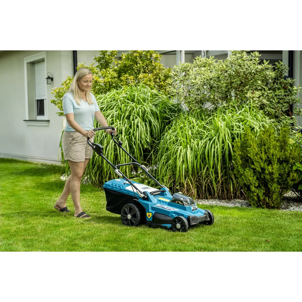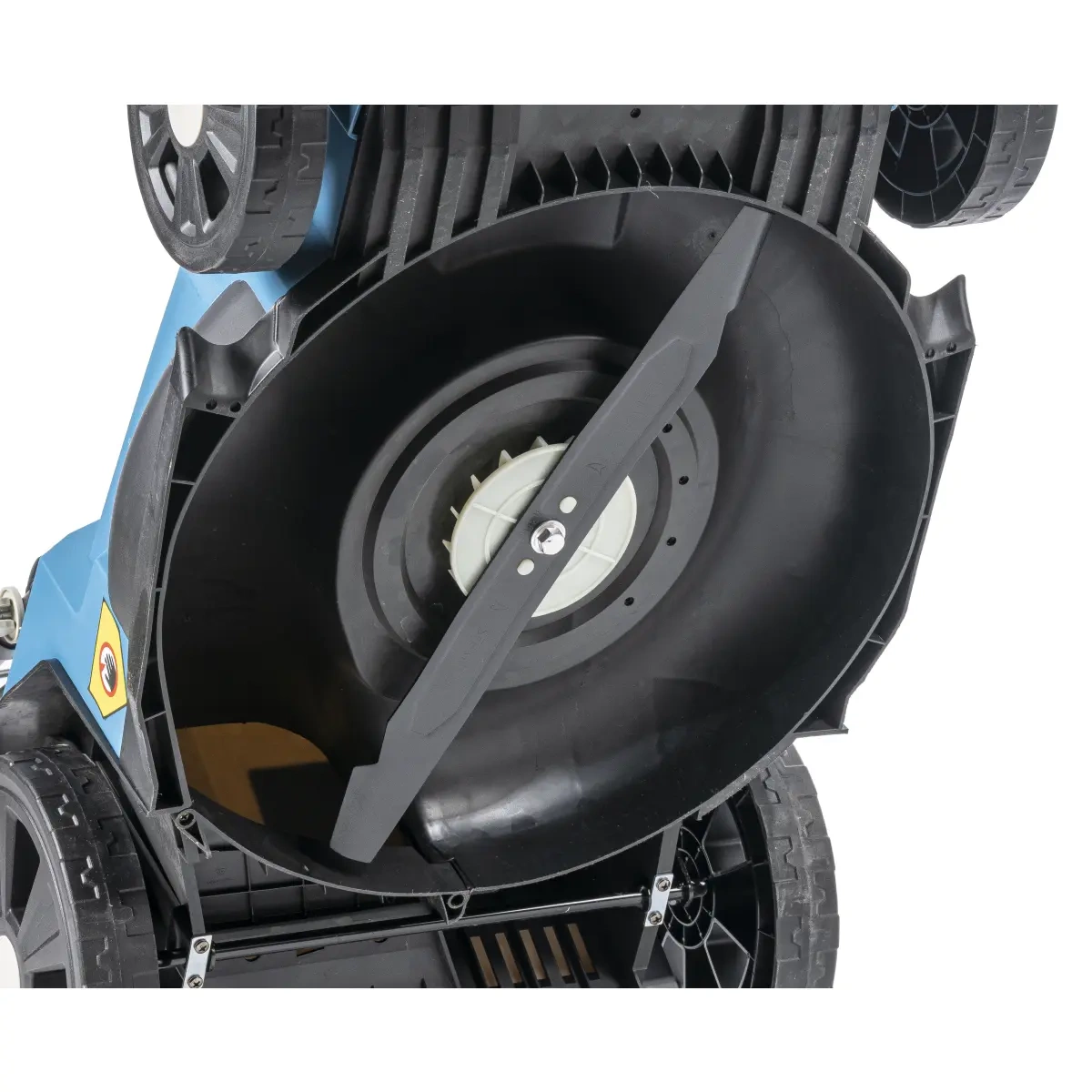Šī mašīna ir paredzēta pļ aušanai un zāliena kopšanai. To darbina izturīgs bezsuku motors. Šī konstrukcija nodrošina ļoti klusu darbību. Pļaujmašīnas pļaušanas platums ir 430 mm, tāpēc tā ir ideāli piemērota vidēja izmēra un lielākiem dārziem. Kompaktais, vieglais dizains un lielie riteņi atvieglo manevrēšanu. Pļaušanas augstums ir nepārtraukti regulējams 6 pozīcijās (25-75 mm). Pļaujmašīnai ir mulčēšanas/sasmalcināšanas funkcija, kas samazina zāles apjomu. Salokāmais rokturis un tīklveida grozs atvieglo pārvietošanu un transportēšanu. Lielāka tvertnes ietilpība (50 litri) ilgākam darbam bez groza iztukšošanas.