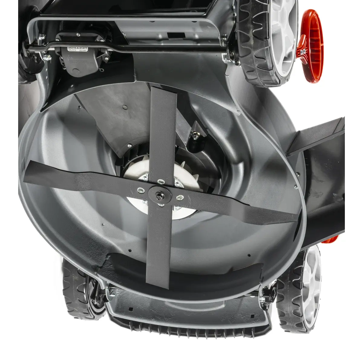 Divas asmeņu sistēma, kas izmantota pļaujmašīnā, palielina pļaušanas un zāles savākšanas efektivitāti, bet kompakta konstrukcija un lielie riteņi atvieglo darbu un pārvietošanos. Pļaušanas augstumu var centrāli regulēt sešās pozīcijās (25-75 mm). Pļāvējam ir mulčēšanas/slīpēšanas funkcija, tādējādi samazinot novāktās zāles apjomu.
