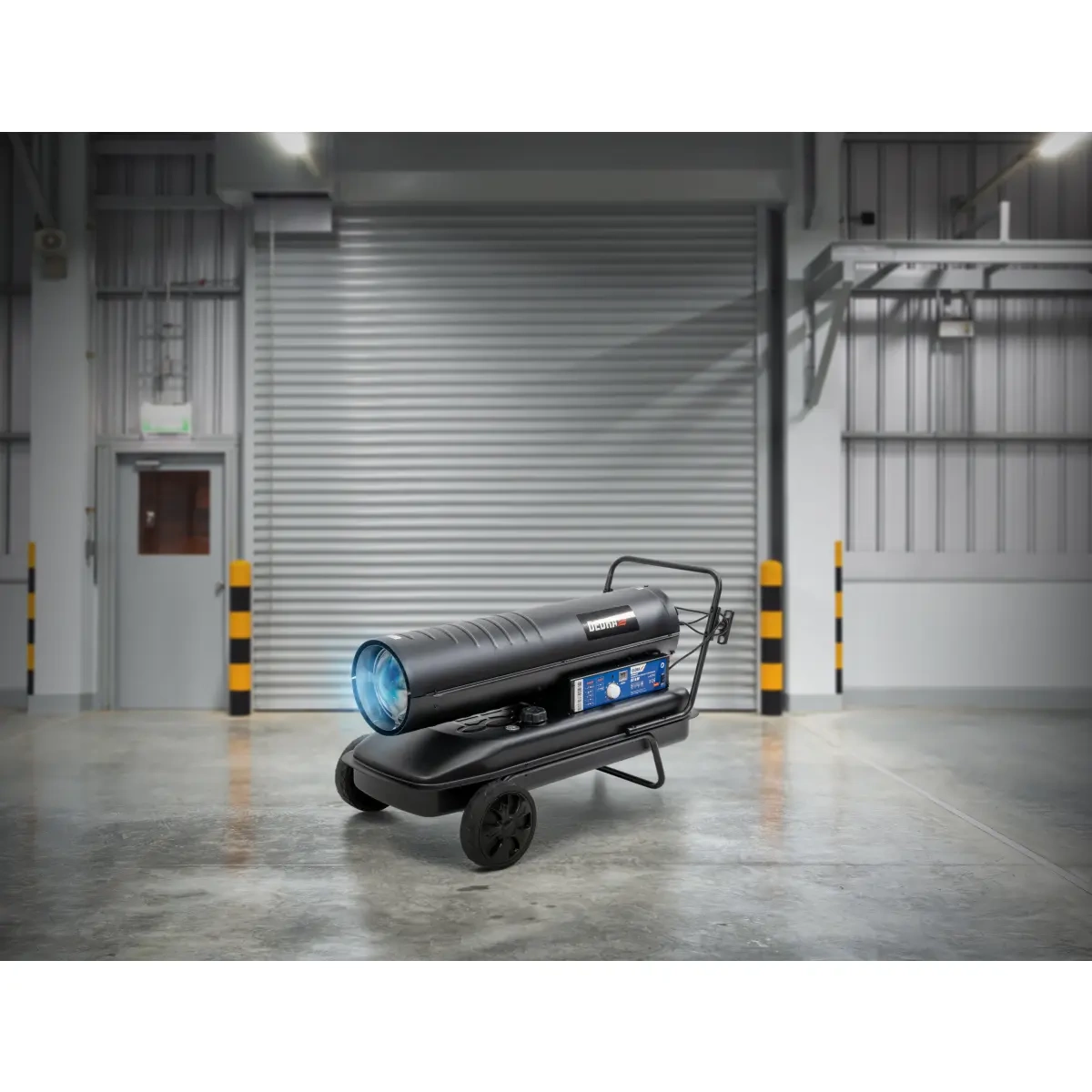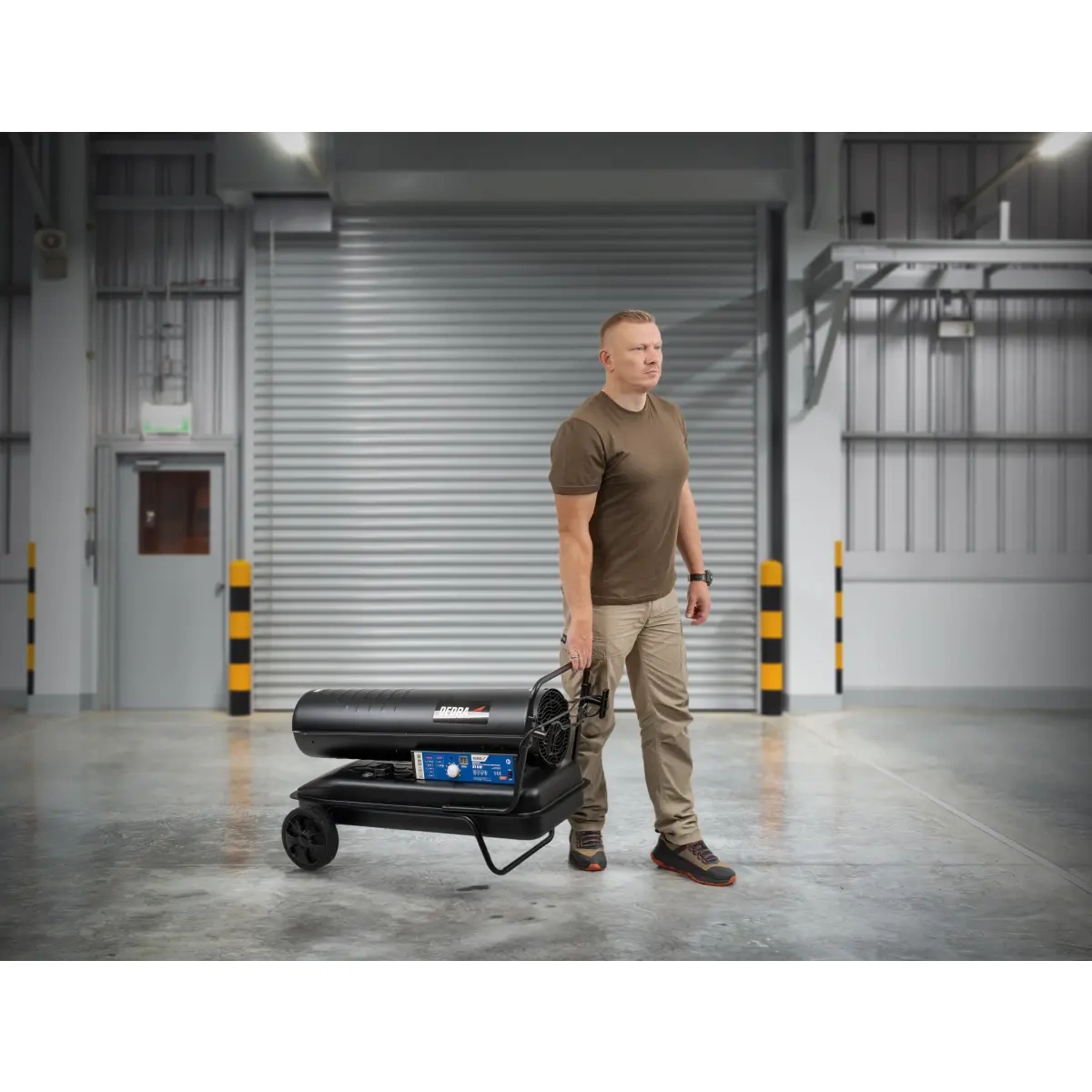 DED9951A priešpriešinio srauto šildytuvas skirtas naudoti uždarose patalpose. Jis naudojamas negyvenamosioms patalpoms, pavyzdžiui, dirbtuvėms, sandėliams, gamybinėms patalpoms, šiltnamiams arba remonto ir statybos darbų metu, šildyti. Šildytuvą galima eksploatuoti naudojant dyzelinį kurą arba lengvąjį mazutą. Šildytuvą galima naudoti tik gerai vė dinamose patalpose. Metalinis korpusas neįkaista net ir ilgai veikiant. Metalinis korpusas neįkaista net ilgai veikiant. Šildytuve yra lengvai įskaitomas ekranas, kuriame rodoma aplinkos temperatūra, ir temperatūros reguliavimo rankenėlė. Dėl ratukų ir rankenos lengva transportuoti ir laikyti.Šildytuvas turi lengvai įskaitomą ekraną, kuriame rodoma aplinkos temperatūra, ir temperatūros reguliavimo ratuką.Šio gaminio negalima naudoti kaip pagrindinio šildymo šaltinio.