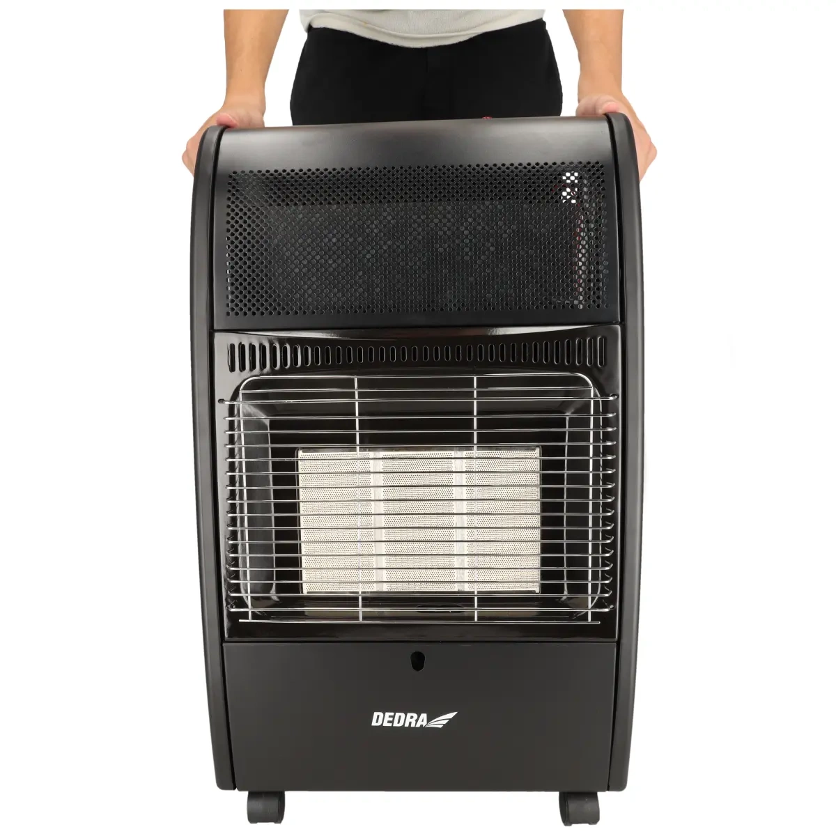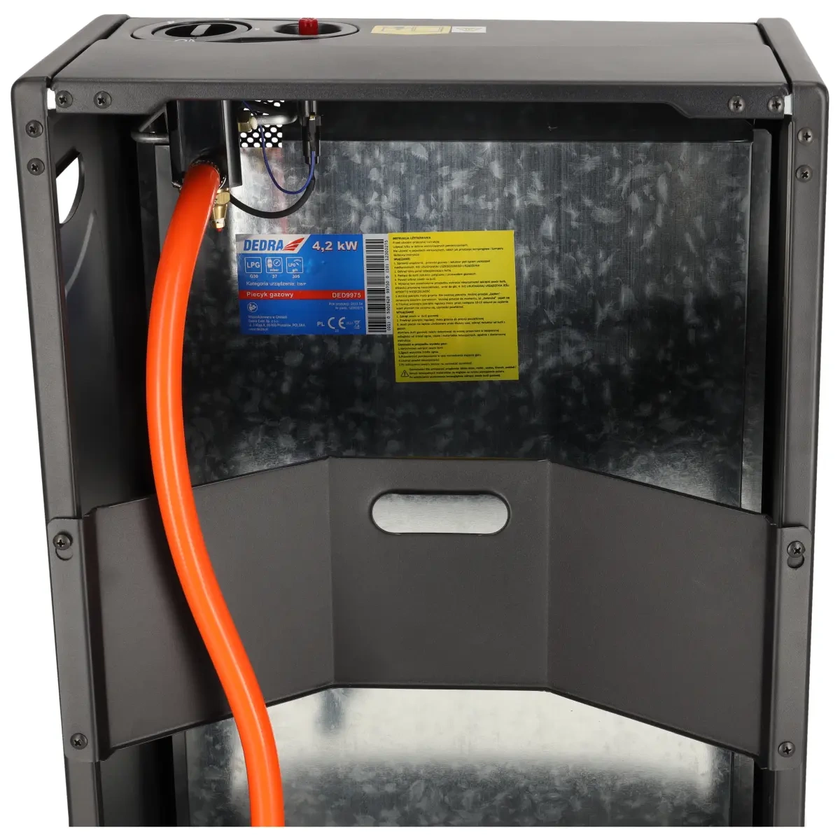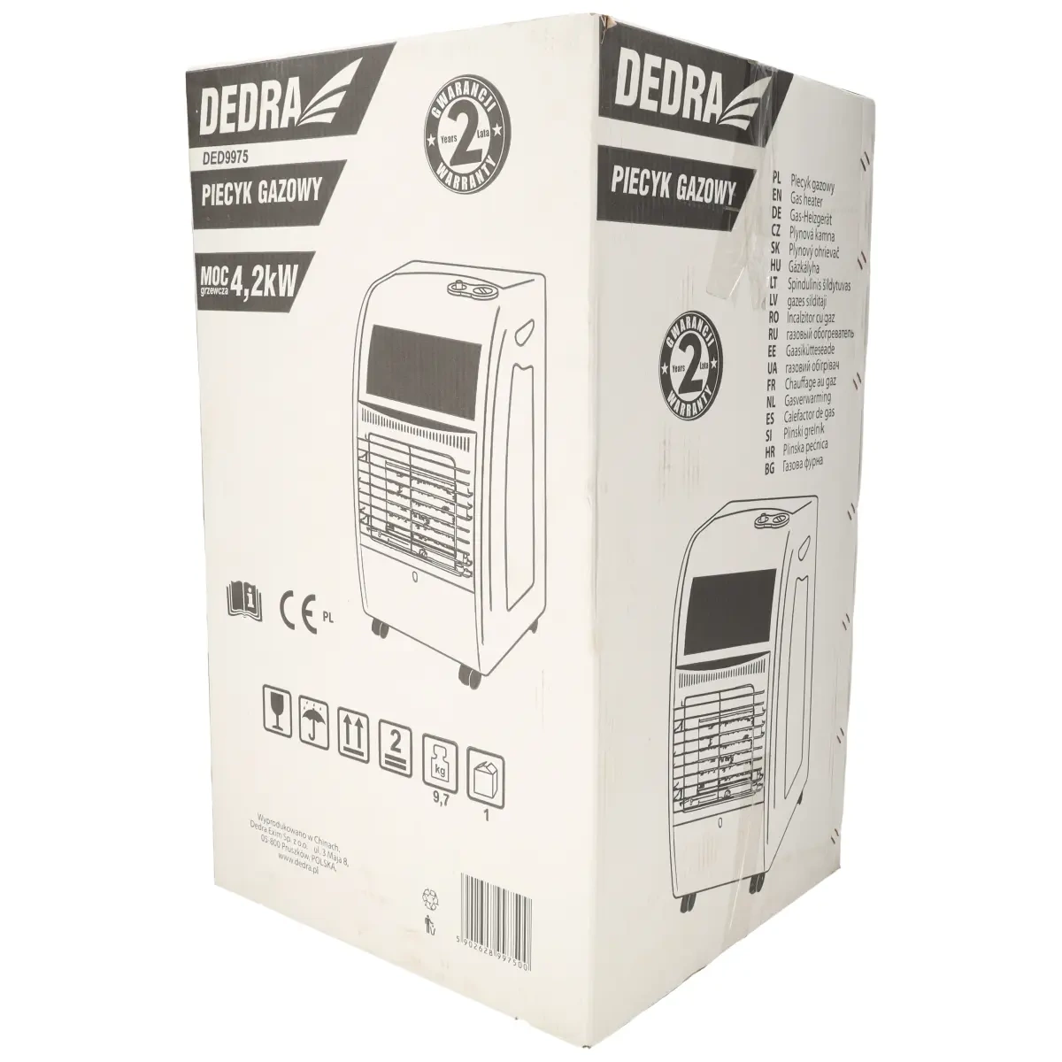 Dujinis šildytuvas DED9975 yra prietaisas, skirtas naudotiu ž d a r o s e patalpose ir naudojamasgyvenamosioms ir komercinėms patalpoms, pavyzdžiui, biurams, parduotuvėms, sandėliams, dirbtuvėms, garažams ir t. t. Šį prietaisą galima naudoti tik tose patalpose, kuriose yra veiksminga ventiliacija. Krosnelę galima naudoti tik tose patalpose, kuriose yra veiksminga ventiliacija. Viryklė turi pjezoelektrinį degiklį ir trijų pakopų kaitinimo galios reguliavimą. Įrenginys turi apsaugą nuo perkaitimo. Transportavimo ratai, metalinis korpusas.Šio gaminio negalima naudoti kaip pagrindinio šildymo šaltinio.Savybės: