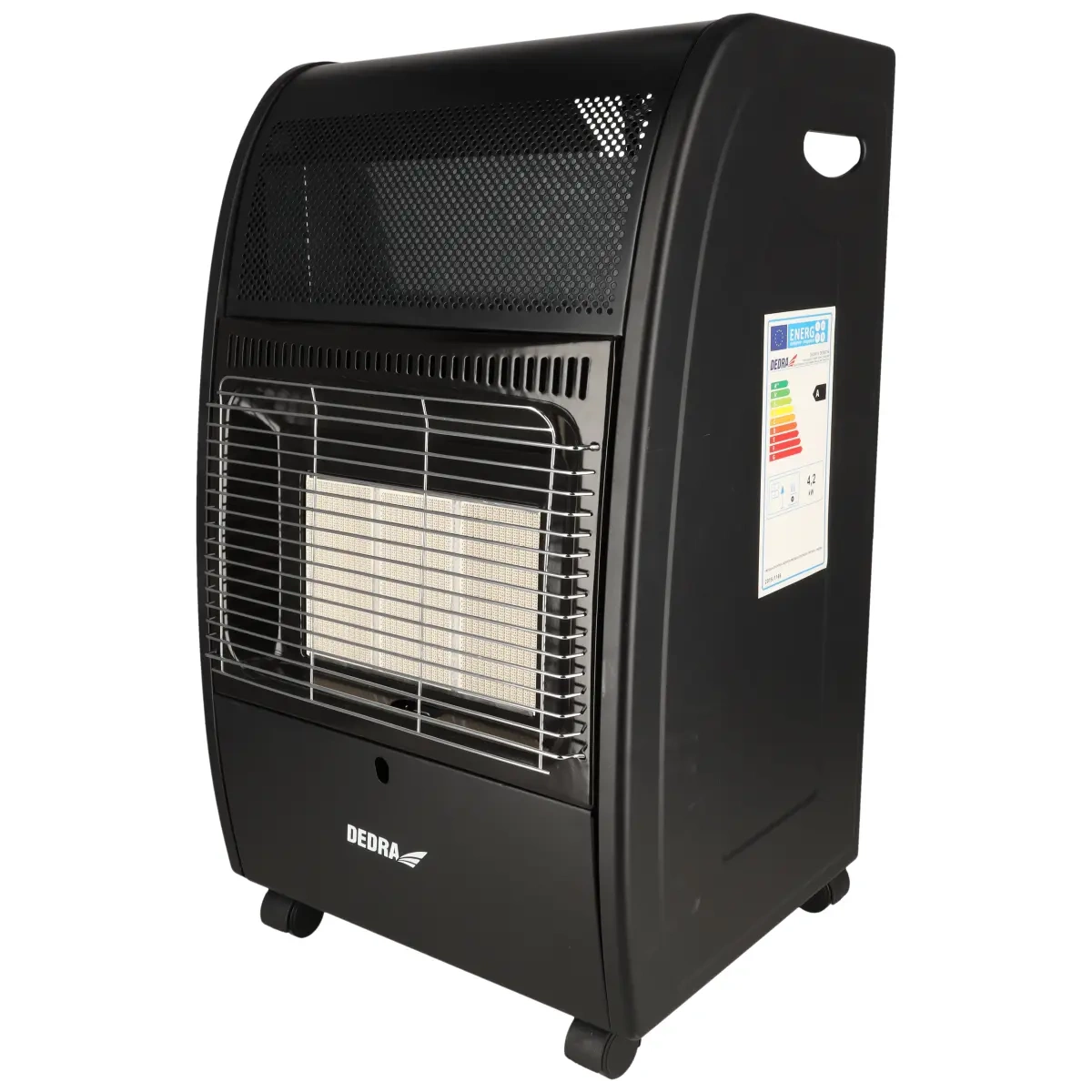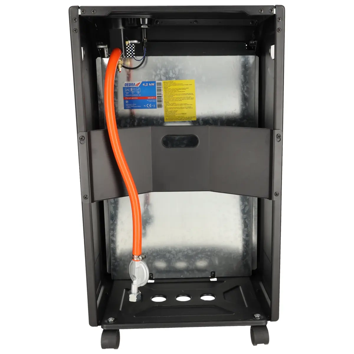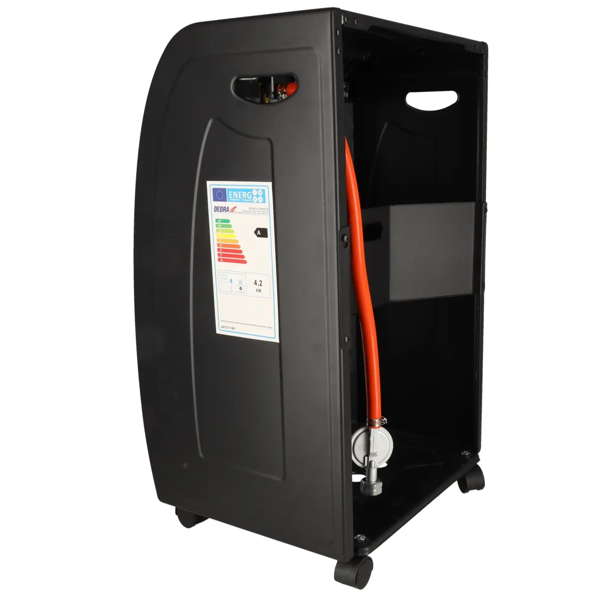 Dujinis šildytuvas DED9975 yra prietaisas, skirtas naudotiu ž d a r o s e patalpose ir naudojamasgyvenamosioms ir komercinėms patalpoms, pavyzdžiui, biurams, parduotuvėms, sandėliams, dirbtuvėms, garažams ir t. t. Šį prietaisą galima naudoti tik tose patalpose, kuriose yra veiksminga ventiliacija. Krosnelę galima naudoti tik tose patalpose, kuriose yra veiksminga ventiliacija. Viryklė turi pjezoelektrinį degiklį ir trijų pakopų kaitinimo galios reguliavimą. Įrenginys turi apsaugą nuo perkaitimo. Transportavimo ratai, metalinis korpusas.Šio gaminio negalima naudoti kaip pagrindinio šildymo šaltinio.Savybės: