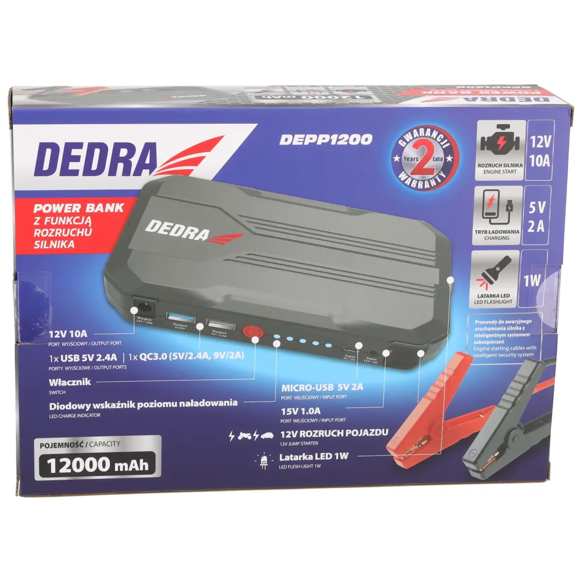 Elektros energijos baterijos tapo nuolatine mūsų namų ir kuprinių dalimi, dažnai padedančia įkrauti telefonus, kai neturime prieigos prie elektros lizdo. Tačiau ar yra powerbank, skirtas užvesti automobilį,kai jis neužsiveda? DEDRA DEPP1200 powerbank su variklio paleidimo funkcija - tai ne įtaisas, o privalomas įrankis šaltuoju žiemos sezonu, ypač jeijūsų automobilis linkęs kaprizuotis. Rastižmogų, kuris n o r ė t ų padėti užvesti automobilį, yra pakankamai sunku, o rasti žmogų, turintį skirstomuosius kabelius, - dar sunkiau. Išvenkite streso dėl išsikrovusio akumuliatoriaus. Z Su automobilio akumuliatoriaus paketu galite ne tik užvesti variklį, bet ir naudoti jį kaip standartinį maitinimo šaltinį. Juo galiteįkrauti išmanųjį telefoną, "bluet ooth" garsiakalbį arba planšetinį kompiuterį. Integruotas greitojo įkrovimo lizdas leidžia greitai įkrauti telefoną ilgai jo nejungiant prie elektros tinklo.