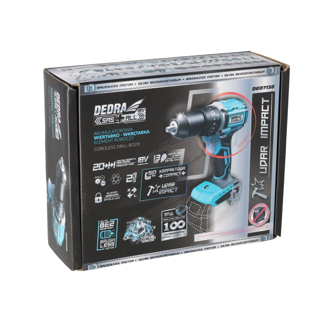 Kompaktiškas akumuliatorinis gręžtuvas ir gręžtuvas su smūgio funkcija, DEDRA SAS+ALL DED7138 18V, be šepetėlių