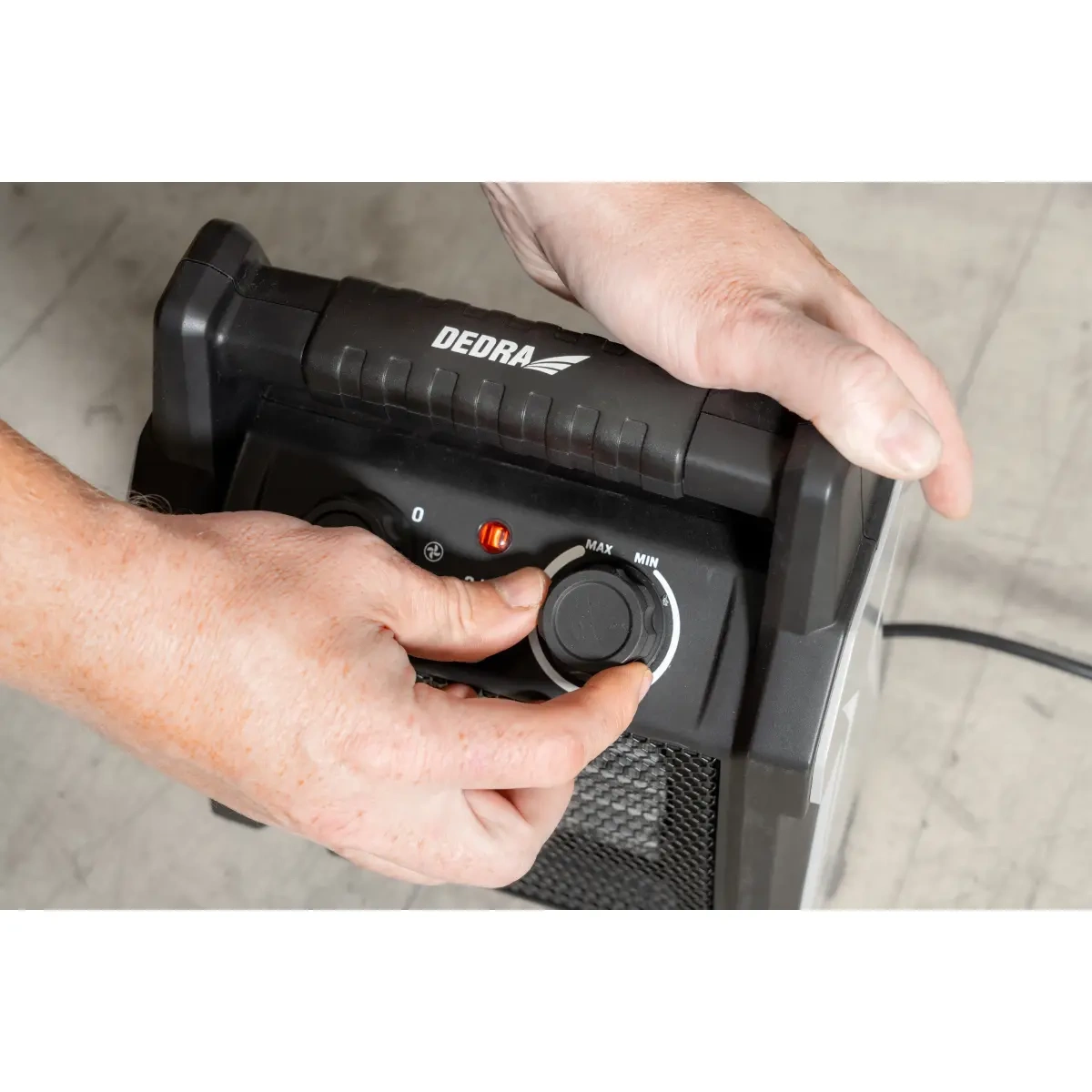 - Tvirtas korpusas – storas plastikas apsaugo šildytuvą nuo pažeidimų