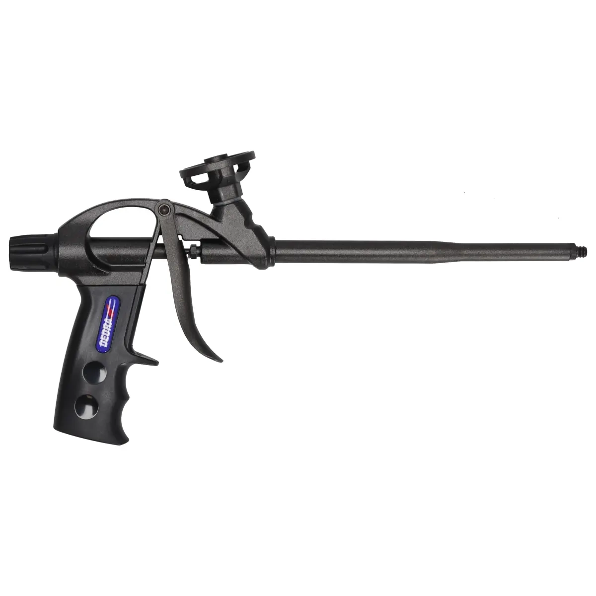 Pistolet do pianki montażowej model 1201-21. W tym pistolecie zastosowano mosiężną dysze, dzieki której aplikacja pianki jest niezwykle precyzyjna. Strumień pianki możemy regulować za pomoca pokrętła znajdującego się w tylnej części pistoletu. Wyprofilowana rękojeść wykonana z tworzywa stucznego, zapewnia użytkownikowi pewny chwyt podczas pracy. Teflonowa głowica oraz kulka, zapewnia szczelne i bezpieczne połaczenie pistoletu z puszką piany.