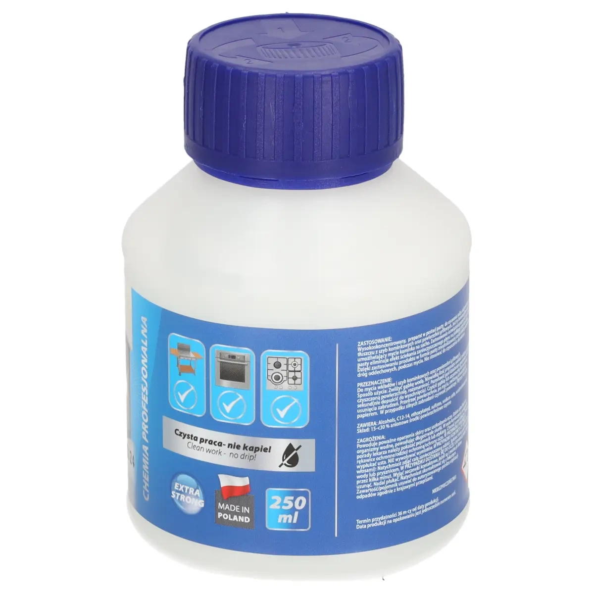 Ta profesjonalna pasta idealnie się nada do mycia szyb kominkowych, grilla czy piekarników - usuwa sadzę, zadymienia oraz przypalony tłuszcz. Wyjątkową zaletą tego środka do czyszczenia, odróżniającą produkt od innych tego typu, jest konsystencja kremu, dzięki temu produkt nie skapuje z szyby kominkowej na podłogę. Zapewnia to czystość w miejscu pracy i eliminuje efekt ściekania płynu na podłogę, gdyż preparat nie rozchlapuje się nam jak ma to miejsce w przypadku produktów o konsystencji płynnej. Dodatkowo produkt łatwo zmyć za pomocą wody i gąbki.
