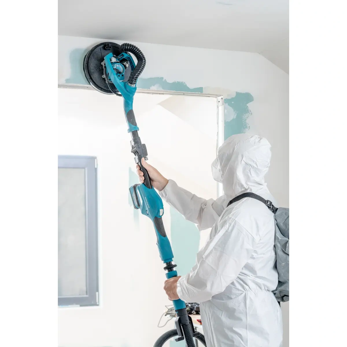 To, co wyróżnia tę szlifierkę, to poziomujące mocowanie na głowicy, które niezmiernie ułatwia pracę przy suficie, oraz specjalnie zaprojektowana turbina, która zaciąga urobek prosto do worka. Dodatkowo, składana konstrukcja ułatwia przechowywanie oraz bezpieczny transport urządzenia, a teleskopowy, składany wysięgnik o długości 130-160 cm umożliwia dostosowanie urządzenia do wzrostu użytkownika lub warunków w pomieszczeniu
