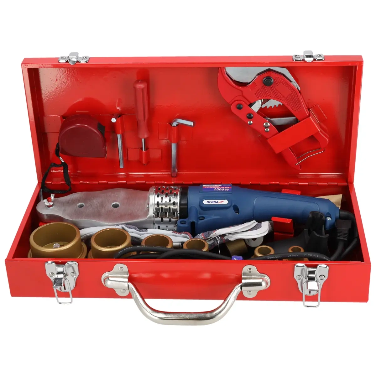 DED7514 de 1500 W este utilizat pentru sudarea țevilor și fitingurilor din polimeri (PE-polietilenă, PP-polipropilenă, PB-polibutenă) utilizate pentru instalații de apă sau deî n c ă l z i r e centrală. Mașina este echipată cu plăcuțe de încălzire interschimbabile,c a r e permit încălzirea simultană a suprafețelor interioare și exterioare ale pieselor care urmează să fie îmbinate. DED7514 este echipat cu un control continuu al temperaturii până la un maxim de 300°C.Caracteristicile arzătorului de țevi DEDRA DED7514: