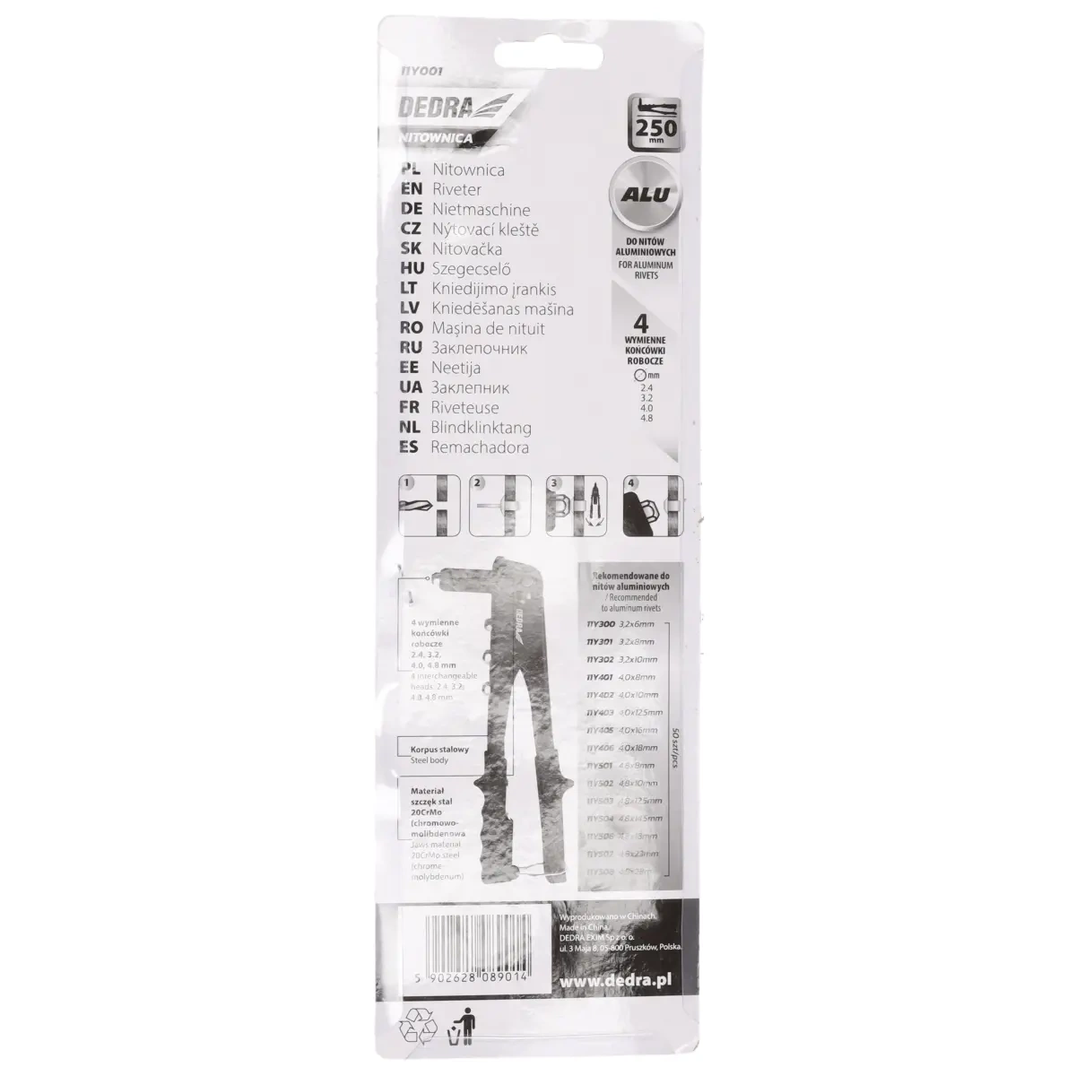 Unelul de nituire este unul dintre cele mai utile unelte din orice atelier saugospodărie. Acesta permite îmbinarea rapidă și permanentă a pieselor de prelucrat prin presarea și răspândirea unui știft metalic printr-o gaură în două suprafețe de material îmbinate. Unealta de nituire din aluminiu DEDRA 11Y001 permite om u n că confortabilă și eficientă datorită brațelor sale lungi. Piesele de nas interschimbabile permit selectarea unui nit de dimensiuni mediipentru o gaură specifică. Cele 4 piulițe detașabile sunt montate în corpul sculei de nituire, ceea ce înseamnă că sunt întotdeaunala îndemână și sunt greu de pierdut. Matrița de nituire are un dispozitiv de blocare pentru un transport și o depozitare ușoară. Corpul uneltei de nituire este fabricat din oțel pentru a asigura o rezistență și o rigiditate adecvate. Lungimea brațului de250 mm permite o muncă eficientă. Mânerele sunt finisate într-un material plastic de înaltă
