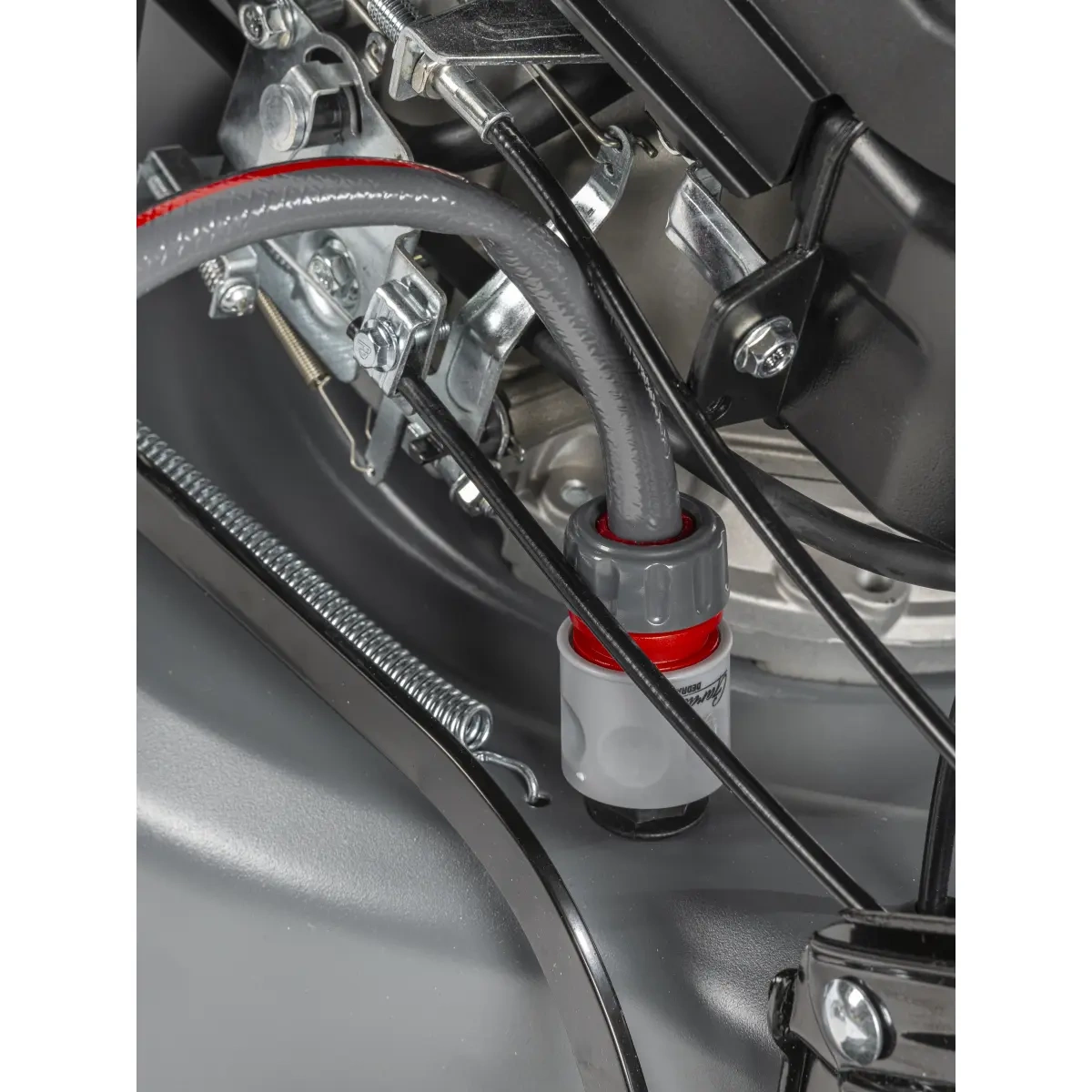 Кроме того, газонокосилка имеет функцию очистки корпуса - мы можем подключить садовый шланг с быстросъемным соединением к корпусу газонокосилки - мужское соединение находится на корпусе косилки. Запуская двигатель, открываем кран, и вода направляется через шланг в корпус, а лезвие вращается, распределяя воду и «моет» газонокосилку снизу - там, где скапливается больше всего высохшей и скопившейся травы.