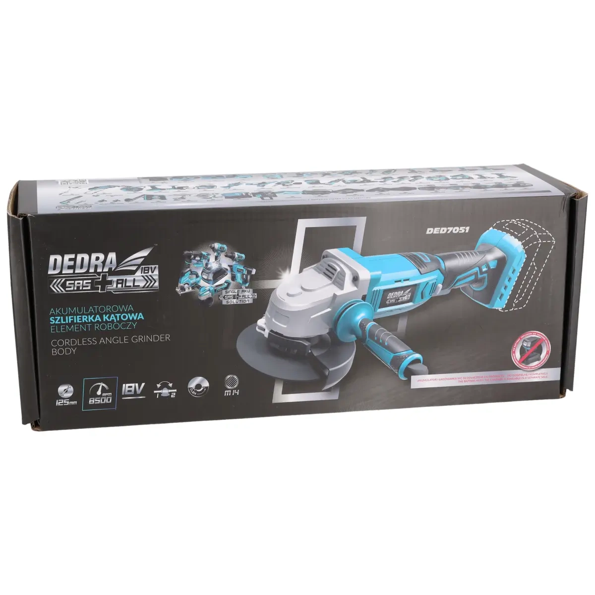 Ovo je alat za rezanje i brušenje. Motor brusilice postiže brzinu od 8500 okretaja u minuti i radi s diskovima od 125 mm i 115 mm. Mlinica je opremljena sigurnosnom sklopkom, koja je dizajnirana da prekine napajanje kada je uređaj pod prevelikim pritiskom na materijal koji se obrađuje, što može dovesti do oštećenja ili pregrijavanja uređaja. Sustav brze montaže štitnika, dvopoložajna bočna ručka i gumirana ručka te izduženo kućište značajno poboljšavaju udobnost korištenja uređaja. Ključ za zamjenu diska nalazi se u bočnoj ručki, zahvaljujući čemu ga korisnik uvijek ima pri ruci kada je potrebno zamijeniti disk ili drugi radni vrh. Kućište je izrađeno od najlona s dodatkom staklenih vlakana, zahvaljujući čemu je povećana otpornost na mehanička oštećenja i UV zračenje. Ergonomiju i udobnost rada poboljšavaju: mala težina uređaja i gumirana ručka. Preporučena baterija za rad s akumulatorskom kutnom brusilicom je 4,0 Ah DED7034.