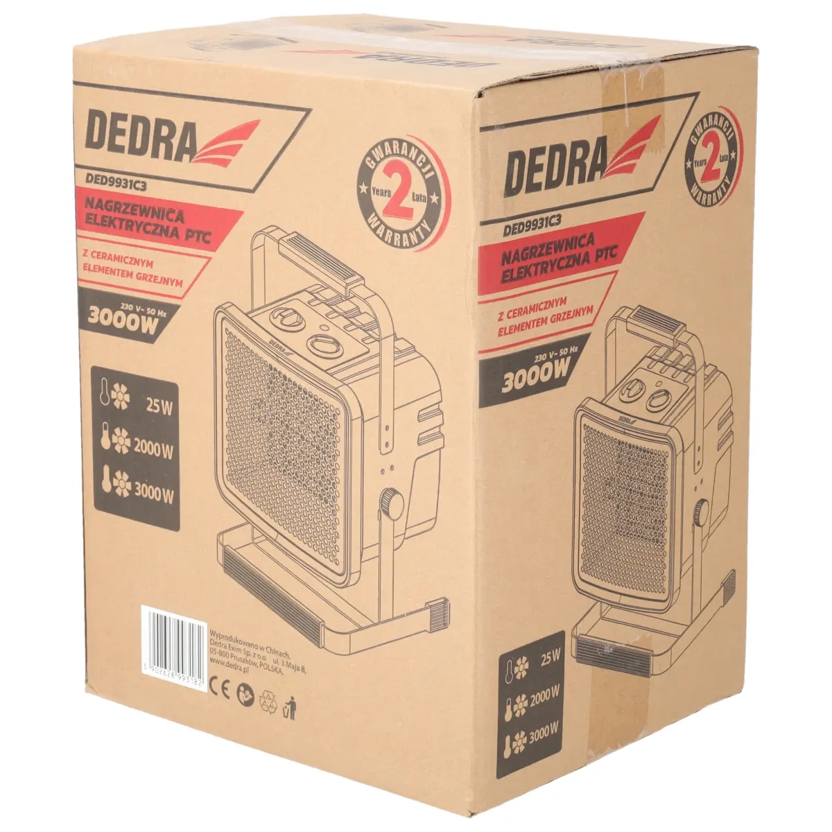 Električna grijalica DED9931C3 je uređaj namijenjen za unutarnju upotrebu. Koristi se za grijanje stambenih i pomoćnih prostorija kao što su podrumi, garaže, radionice i sl. Uređaj je namijenjen za korištenje kao dodatni izvor topline, ne može biti glavni izvor topline. Postavljanjem gumba za temperaturu na minimum, uređaj se može koristiti kao ventilator bez funkcije grijanja. Keramički grijaći element (PTC) daje osjećaj topline gotovo odmah nakon uključivanja.Uređaj karakterizira tihi rad. Praktična transportna ručka.Ovaj proizvod je prikladan samo za povremenu upotrebu ili za upotrebu u dobro izoliranim prostorijama.