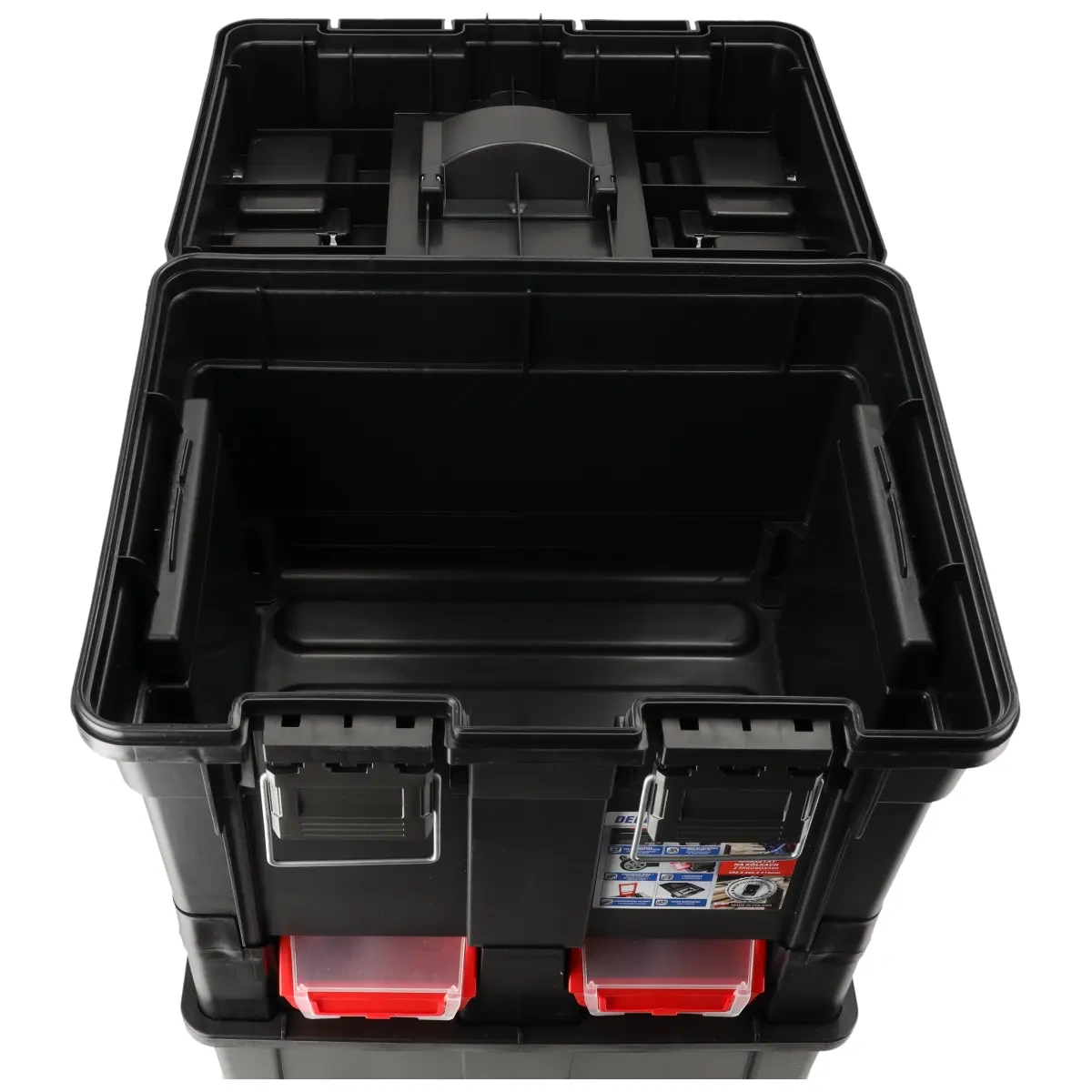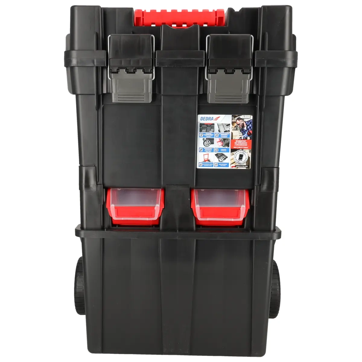 DEDRA N0200 je opremljen s dvije ručke. Središnja pomaže u transportu gornje kutije. Veći, crveni, koji se nalazi na rubu kutije, omogućuje sigurno i praktično premještanje seta kutija pomoću ugrađenih kotača. Ručka je osigurana kliznom bravom "zaključaj/otključaj" koja osigurava udobnost korištenja. Ručka će se podići samo kada vi to želite. Ovo rješenje poboljšava udobnost korištenja i istovremeno štiti ovaj element od slučajnog oštećenja. Stabilnost cjelokupne konstrukcije osigurana je snažnim, izdržljivijim od metalnih poliamidnih spojnica. Kutije su u kutovima osigurane protukliznim poklopcima. Oni pružaju i dodatnu stabilnost i prigušuju vibracije prilikom pomicanja radionice na kotačima ili minimiziraju klizanje kutija tijekom transporta, npr. u automobilu.