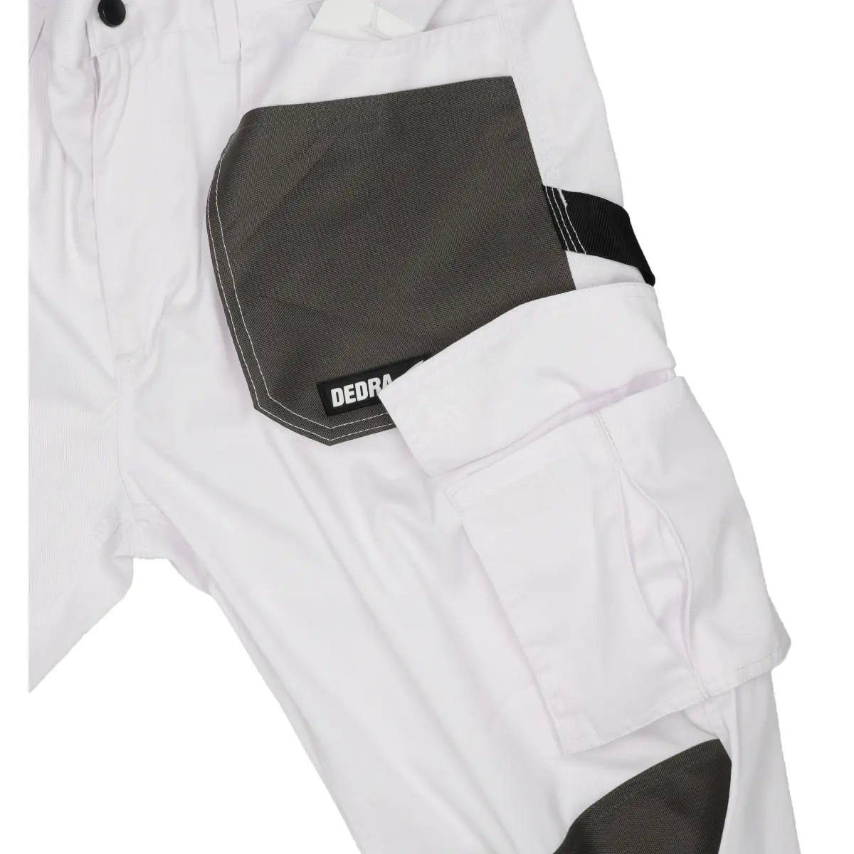 Zaštitne hlače iz linije WHITE LINE izrađene su od mješavine poliestera i pamuka. Ovaj materijal s težinom od 190 g / m² osigurava dobru cirkulaciju zraka i slobodu kretanja. Dodatna pojačanja na koljenima. Ima funkcionalne džepove, uključujući i džep za pametni telefon. Trostruki šavovi koriste se za povećanje čvrstoće hlača. Zbog bijele boje, hlače se posebno preporučuju soboslikarima ili gipsarima. Savršen za tople dane.