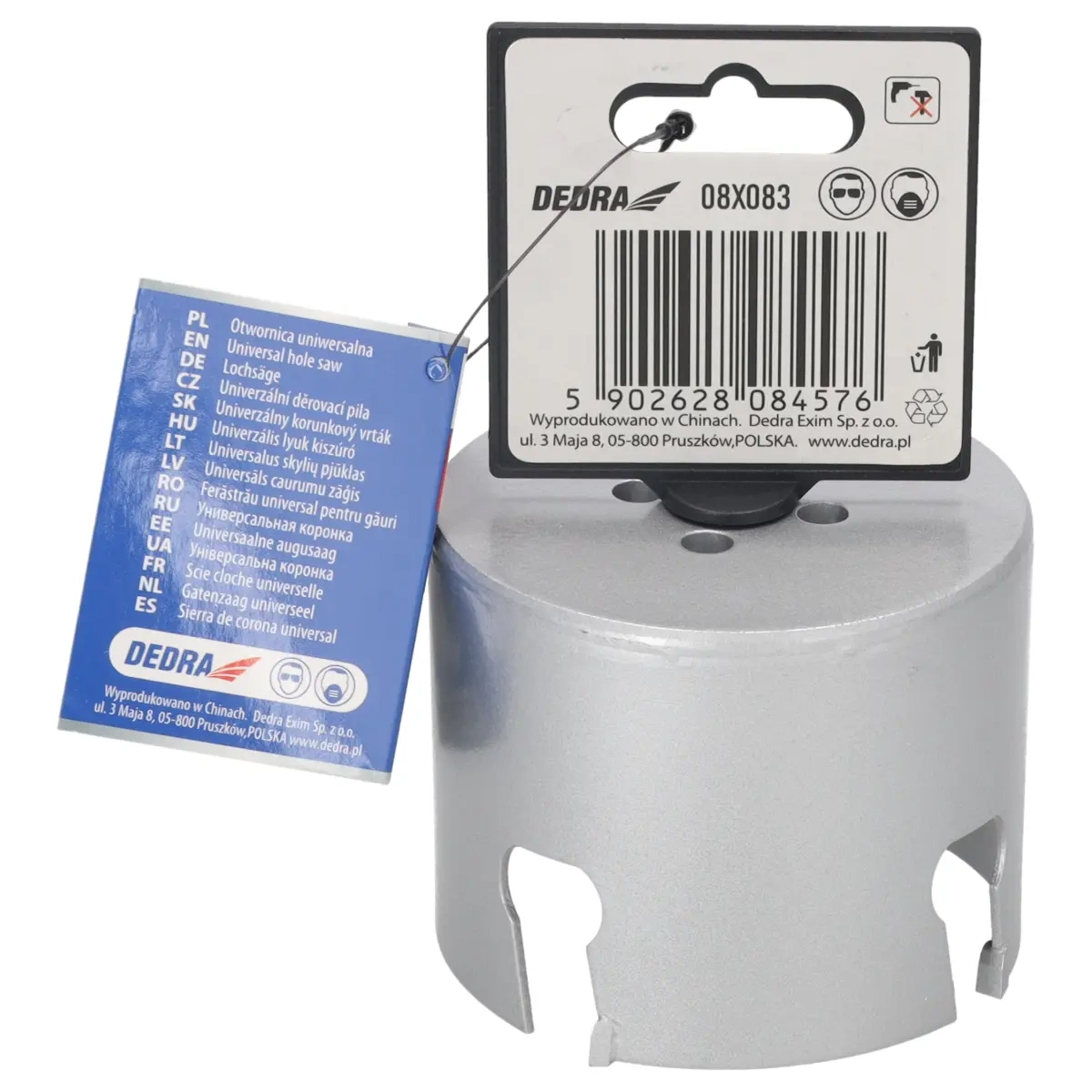 Univerzalna vidija pila za rupe nezaobilazan je alat u DIY radionici. Poseban dizajn tijela s usjekom povećava čvrstoću pile za rupe i poboljšava usmjeravanje rupe. Zahvaljujući upotrebi 10 mm 1/2 "08X001 HEX steznih glava (preporučeno za pile za rupe: 08X019 - 08X030) i 5/8" 08X002 (preporučeno za pile za rupe: 08X032 - 08X152), moguće je koristiti pile za rupe u bušilicama ili bušilicama. Korištenjem stezne glave SDS + 08X003 (preporučeno za pile za rupe: 08X032 - 08X152) možemo koristiti pile za rupe DEDRA 08X sa čekićem u načinu rada bez udarnog bušenja. Za poboljšanje rezultata rezanja i povećanje čvrstoće, pile za rupe imaju nekoliko widia umetaka koji učinkovito režu materijal koji se obrađuje. Korištenjem prikladnog pilot svrdla, DEDRA 08X univerzalna svrdla s widia mogu se koristiti za obradu drva, metala, ploča za namještaj, PVC-a, mineralnih materijala kao što su keramički blokovi, ćelijasti beton ili silikat. Kako bi se povećala čvrstoća pila za provrte, njihovo tijelo izrađeno je od visokokvalitetnog 1,5 mm HCS čelika, a zubi su izrađeni od volfram karbida sa 6% kobalta (YG6X volfram čelik). Kao rezultat toga, poboljšana je kvaliteta i čvrstoća svrdla i povećana učinkovitost bušenja.