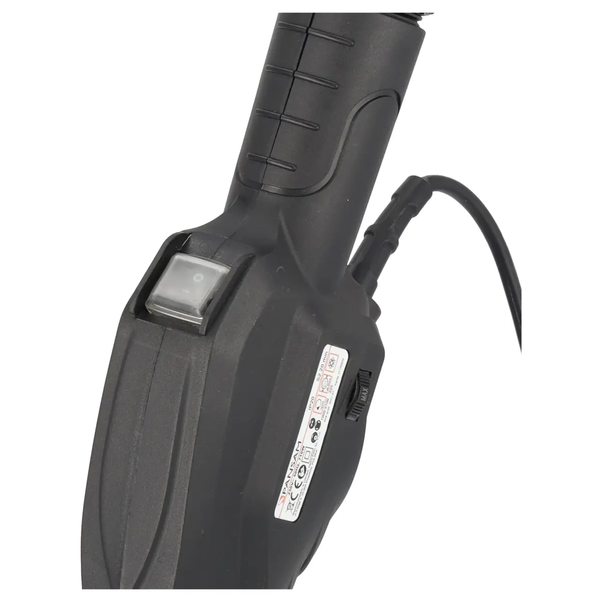 Stroj sa vyznačuje robustnou konštrukciou a ergonomickým dizajnom, čo sa premieta do komfortu a efektivity. Pomocná rukoväť poskytuje bezpečný a stabilný úchop, čím minimalizuje únavu používateľa počas dlhodobej práce, zatiaľ čo nastaviteľné rameno umožňuje optimálne prispôsobiť dĺžku brúsky výške miestnosti.