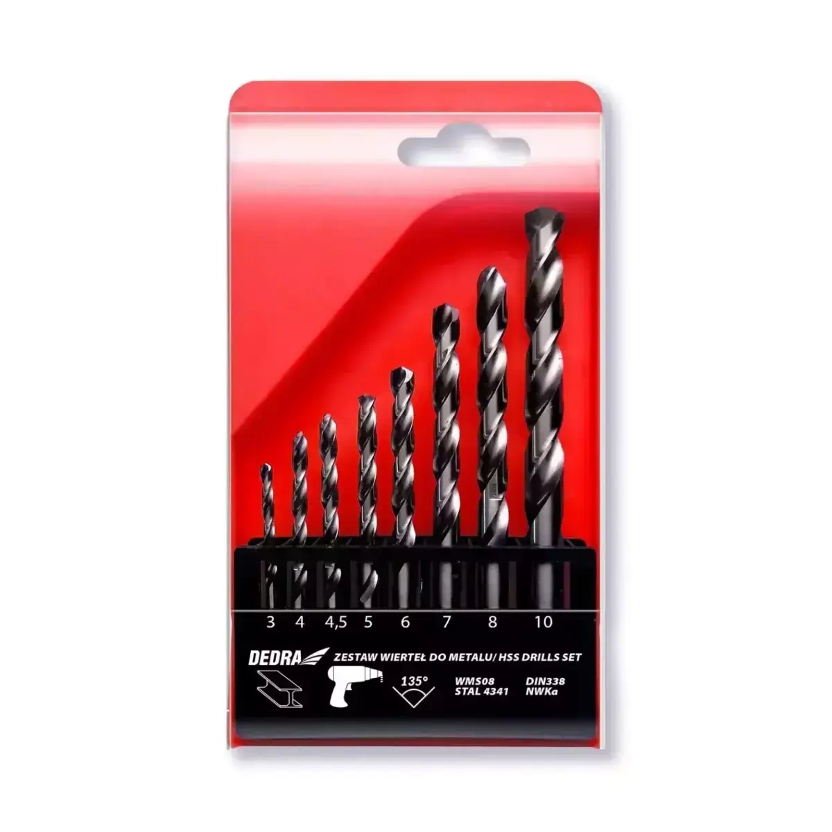 Sada 8 vrtákov do kovu s valcovou stopkou. Vrtáky sú vyrobené z rýchloreznej ocele HSS (oceľ4341). Brúsené rameno zabezpečuje účinné vytláčanie vrtáka z otvoru. Nao b r áb an i e : ocele, neželezných kovov, plastov