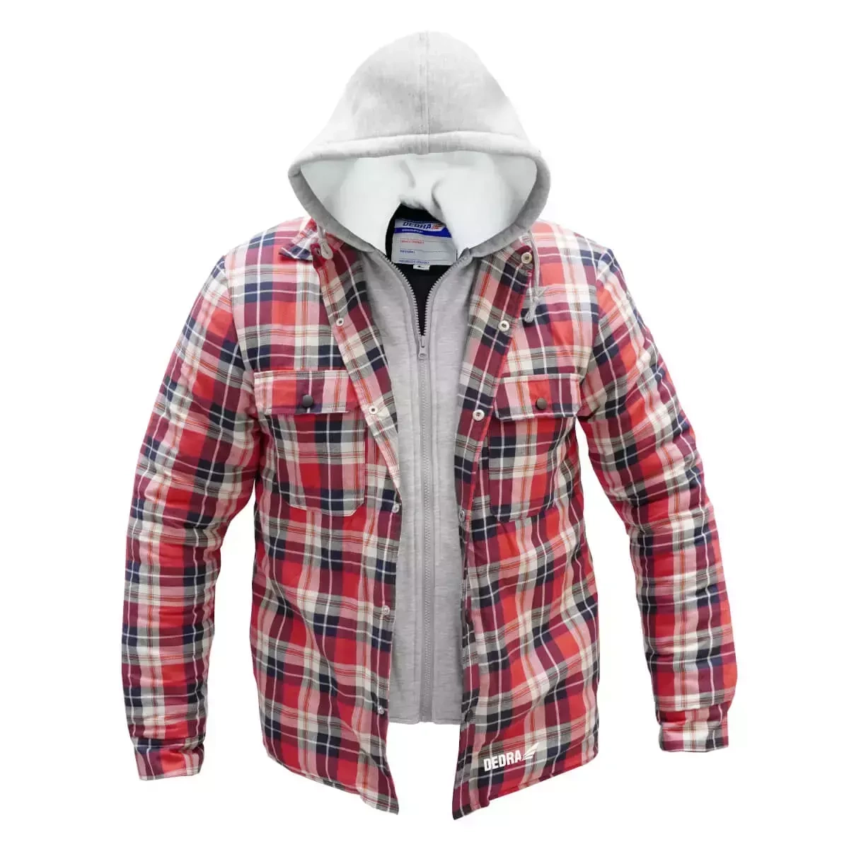 Flanelová bunda je vyrobená zo 100 % bavlny s gramážou 105 g/m² vo vrchnej vrstve. Kapucňa s flísovou podšívkou a sivé vložky sú vyrobené z 80 % polyesteru a20 % bavlny s gramážou 280 g/m². Blúza je vypchatá polyesterovou výplňou. Vďaka rôznemu množstvuv ý p l n e je blúza pohodlná a tepelnevhodná. Telo je vystlané 140 g výplne a rukávy 120 g výplne. Vďaka taftu (klzká podšívka na trupe a rukávoch) sa rukávy pri nosení bundy nevyhrnú. Blúzka sa zapína na gombíky na vrchnej strane a na zips na vnútornej strane.Blúza má dve vrecká na prsiach a dve otvorené bočné vrecká. Manžety bundy sú otvorené a majú zapínanie na cvočky a zadná časť je zaoblená. Logo DEDRA na prednej strane mikiny. K dispozícii vo veľkostiach S-XXXL.
