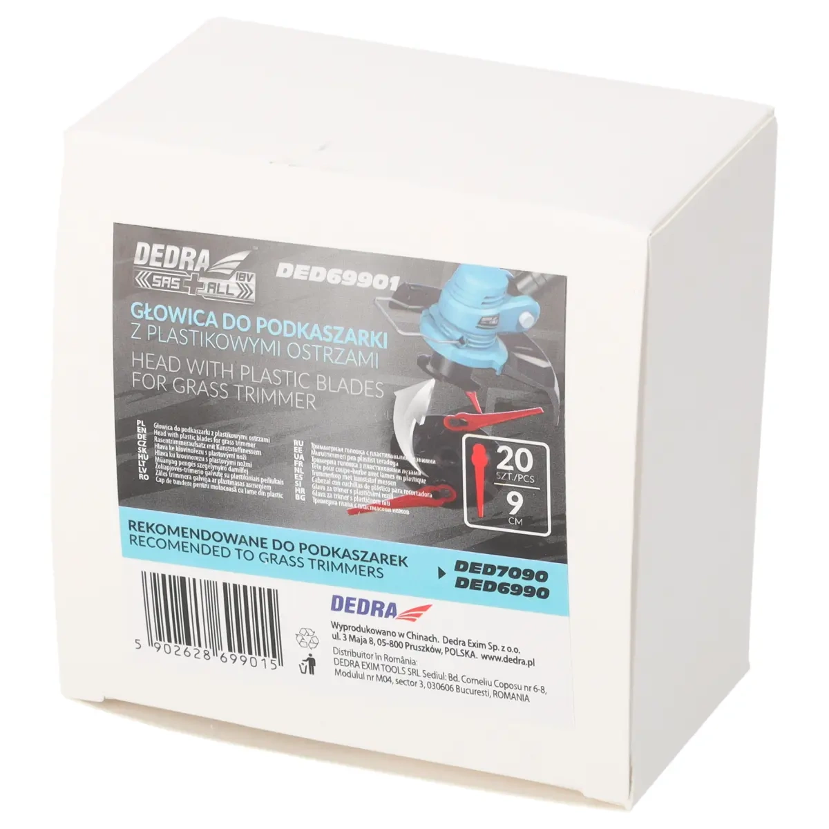 Hlavica DEDRA DED69901 s plastovými nožmi je nevyhnutným príslušenstvom pre akumulátorové vyžínače, ktoré zaručuje rovnomerné a efektívne kosenie trávy a iných porastov.