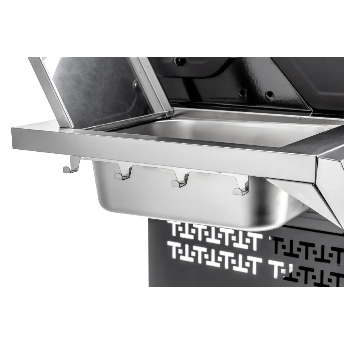 Pre pohodlie používateľa je gril vybavený bočnými policami na riad, koreniny a príslušenstvo a bočným uzatvárateľným zásobníkom na potraviny, ktorý umožňuje hygienické skladovanie pripravených surovín. Háčiky na príslušenstvo a zabudovaný otvárač fliaš zabezpečujú, že všetky potrebné prvky sú vždy po ruke.