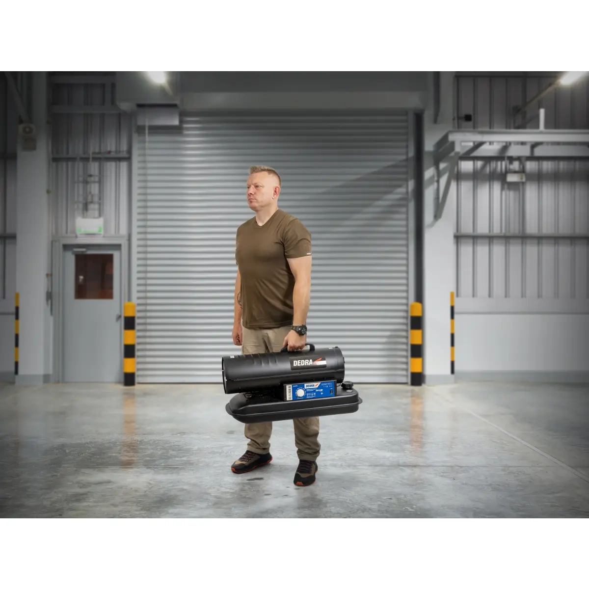 Protitočni grelnik DED9950A je zasnovan za uporabo v zaprtih prostorih. Uporablja se za ogrevanje nestanovanjskih prostorov, kot so delavnice, skladišča, proizvodne hale, rastlinjaki ali med popravili in gradbenimi deli. Grelnik deluje z dizelskim gorivom ali lahkim kurilnim oljem. Napravo lahko uporabljate le v prostorih z uči nkovitim prezračevanjem. Kovinsko ohišje se ne segreva niti med daljšim delovanjem. Za varno delovanje skrbi toplotna zaščitna naprava. Grelnik ima krmilni gumb za nastavitev in prilagajanje temperature. Ročaj za enostavno prenašanje in shranjevanje.Tega izdelka ni mogoče uporabljati kot primarni vir ogrevanja.