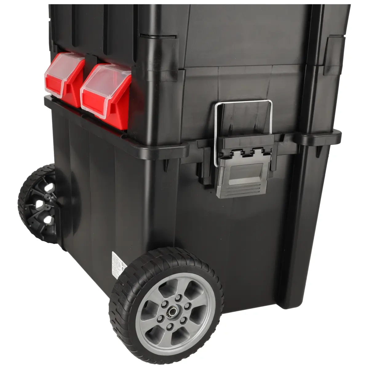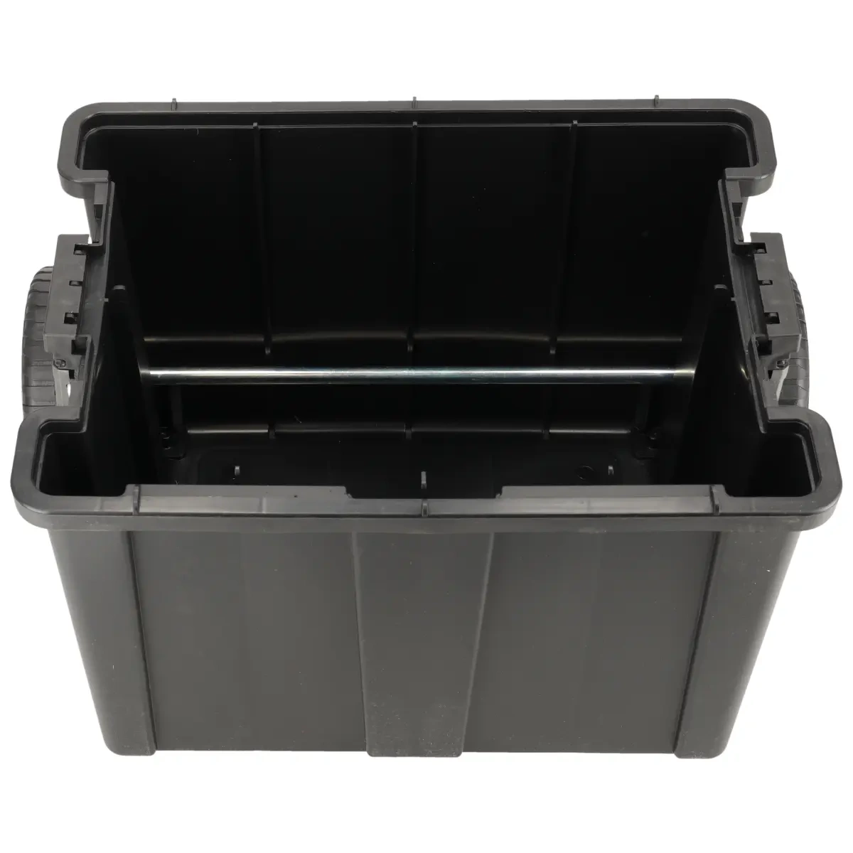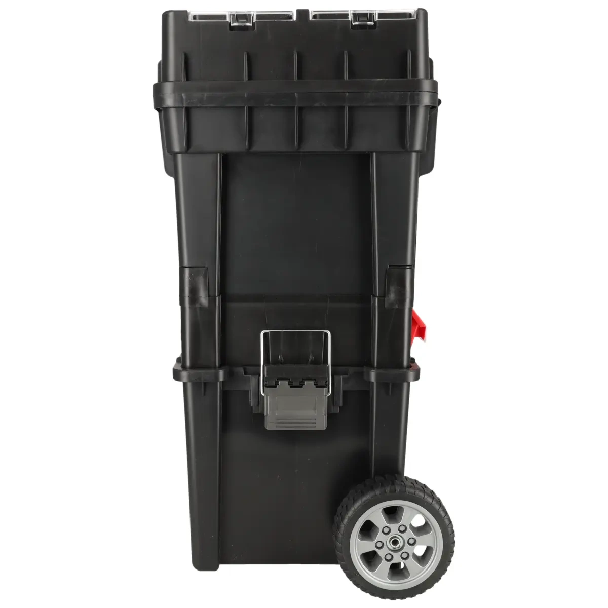 Delavnica na kolesih ima dva sestavna dela-prvi je osnovna škatla s kolesi. Prvi je osnovni zaboj s kolesi. V njegovem prostornem zabojniku lahko shranite največje in najtežjep r e d m e t e . Osnovni zaboj je opremljen s kolesi, ki so sestavljena izd v eh delov: težkih platišč/nog in mehkega plastičnega materiala, ki tvori vozno površino kolesa. Uporaba kovinske osi znatno poveča robustnost in odpornost delavnice za koleščke. Zaradi široke medosne razdalje je voziček med prevozom stabilen, kar zagotavljavarnost za vas in vaše orodje.