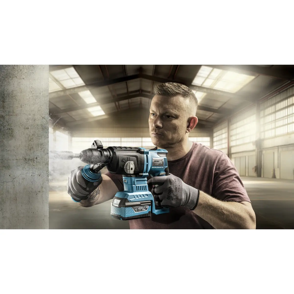To je zmogljivo orodje za izdelavo lukenj v gradbenih materialih, kot so beton, opeka, omet itd. Zmogljiv brezkrtačni motor zagotavlja učinkovito delo v primerj avi s krtačnim motorjem. Zmogljiv brezkrtačni motor je učinkovitejši od orodja s krtačnim motorjem. Zmogljiv brezkrtačni motor je učinkovitejši od motorja s krtačami, dleta pa je mogoče nastaviti za navpično ali vodoravno vrtanje, udarjanje in podiranje. Stroj ima udarno energijo 2,5 J, kar v kombinaciji z visoko hitrostjo udarcev 4 800 udarcev na minuto zadostuje za vse vrste obnovitvenih in zaključnih del.