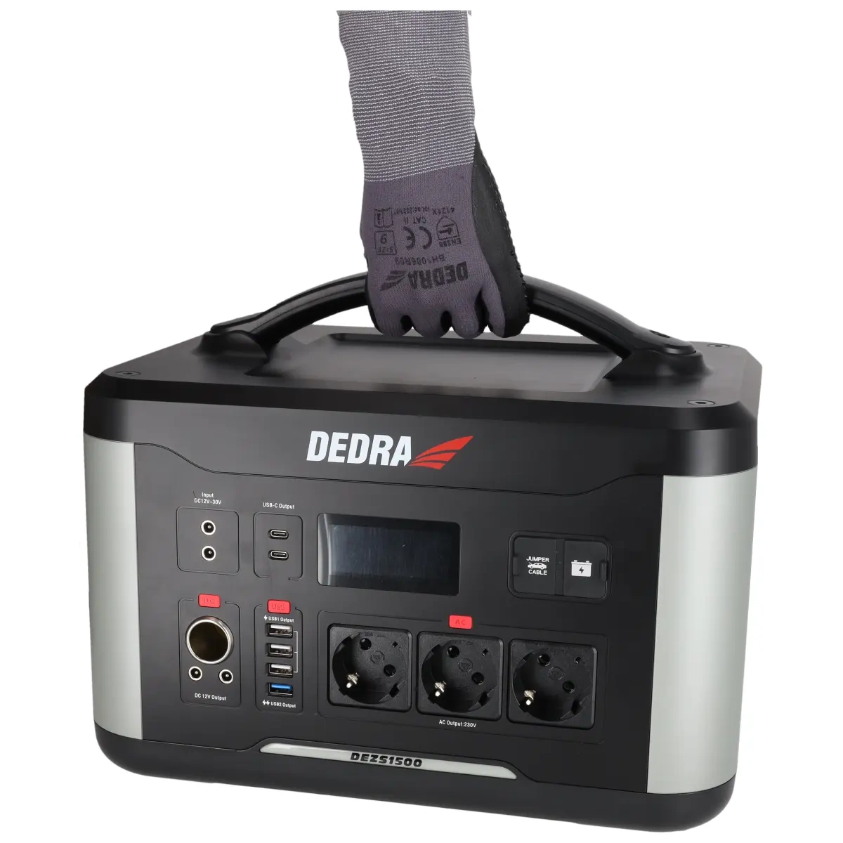Електростанція DEDRA DEZS1500 оснащена можливістю роботи зовнішньої фотоелектричної панелі [купується окремо], що використовується для зарядки пристрою в похідних умовах, тобто без доступу до електромережі. Що варто відзначити в даній моделі, так це функцію запуску двигуна, що є дуже бажаною і корисною опцією, яка може бути використана в екстреній ситуації, наприклад, при розрядженому акумуляторі автомобіля.